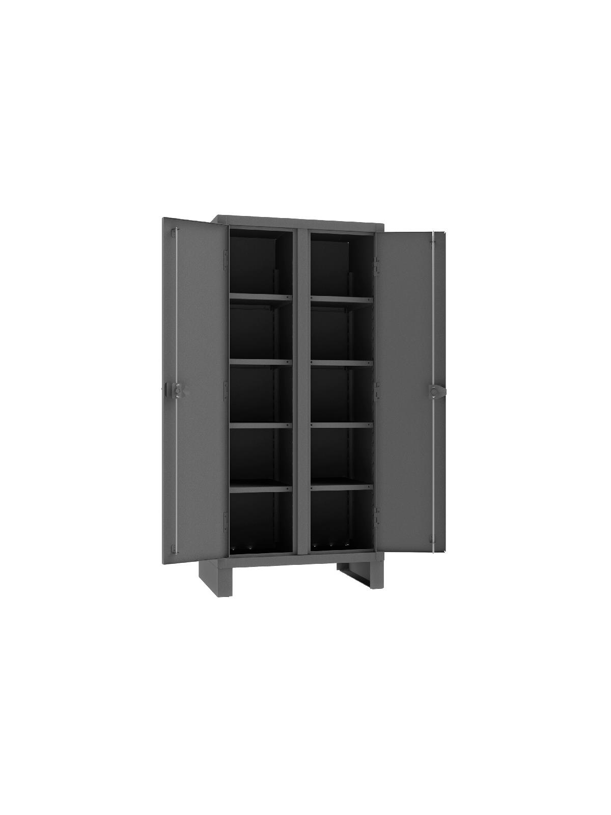 Feature rugged, all-welded 12 ga. steel construction and handsome flush door design. 4 reinforced steel shelves are adjustable on 2-1/2” centers. Includes extra heavy-duty hinge pins that secure doors to avoid sagging. Sturdy 3-point, cast steel locking handles have 3/8” dia. rods and provision for padlock (padlock not furnished). 6" high box style legs offer space for lift truck forks and can be lagged to the floor, constructed of 3/16" steel. Durable Gray powder coat finish. FOB Shipping Point.