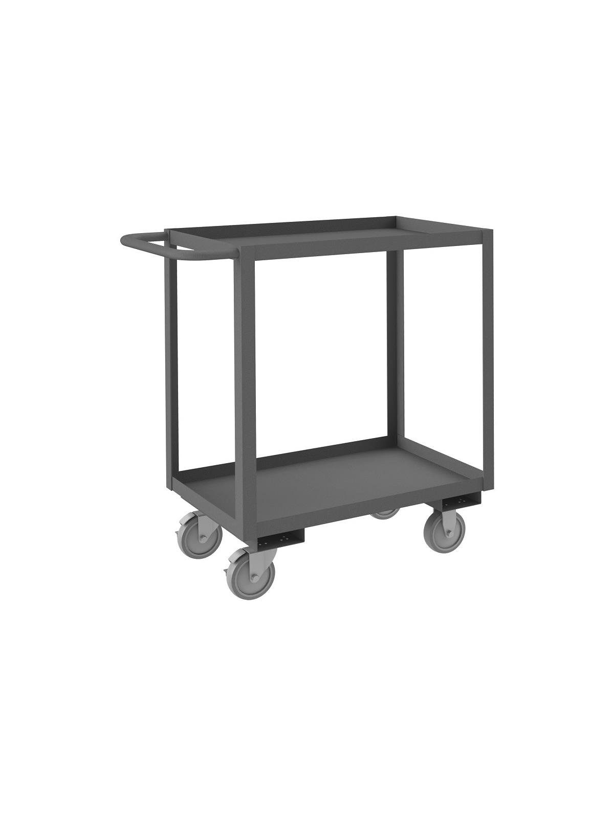 Shelf carts are constructed with 1-1/2" x 1/8" angle iron uprights for added strength. Heavy duty 14 gauge steel shelves. Sturdy tubular push handle. Perfect for transporting heavier parts or stock items. Shelf Stock Carts are available in 1,200 lbs. or 3,000 lbs. capacities. FOB Shipping Point.