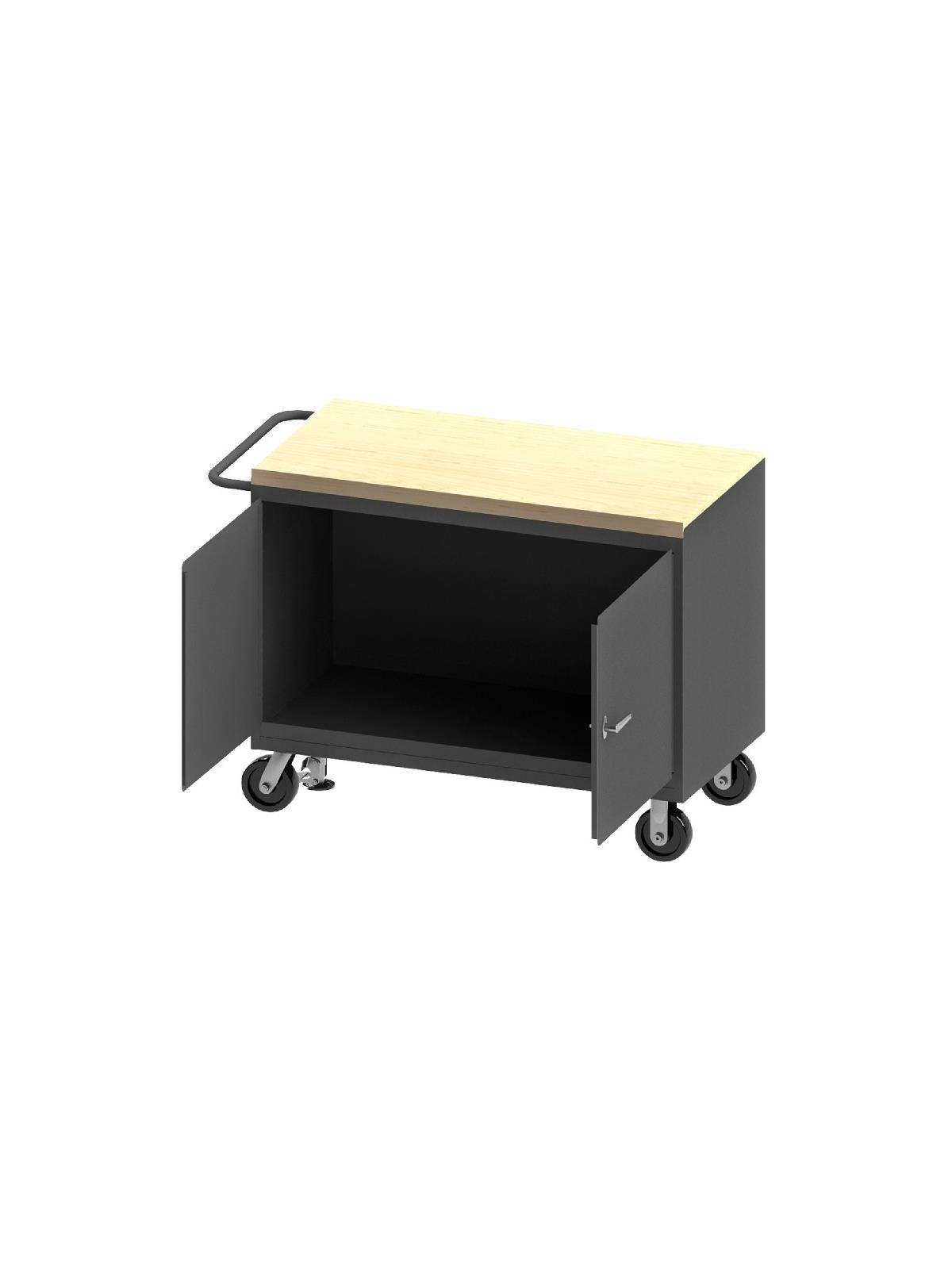 Bench cabinets are constructed of 14 gauge steel. Convenient sturdy work surface with back and end stops on the work surface prevents parts from falling off during transport (MT units not included). Tubular handle for easy maneuverability. Cabinet doors have a 3 point locking system with 4 keys. Rolls smoothly on 5" polyurethane bolt-on casters, (2) swivel with side brakes and (2) rigid. 36"W model has 1,200 lbs. capacity. 48"W model has 2,000 lbs. capacity and includes a floor lock to keep the unit in place while you work. FOB Shipping Point.