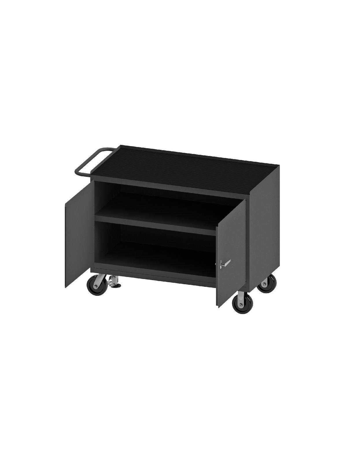 Bench cabinets are constructed of 14 gauge steel. Convenient sturdy work surface with back and end stops on the work surface prevents parts from falling off during transport (MT units not included). Tubular handle for easy maneuverability. Cabinet doors have a 3 point locking system with 4 keys. Rolls smoothly on 5" polyurethane bolt-on casters, (2) swivel with side brakes and (2) rigid. 36"W model has 1,200 lbs. capacity. 48"W model has 2,000 lbs. capacity and includes a floor lock to keep the unit in place while you work. FOB Shipping Point.
