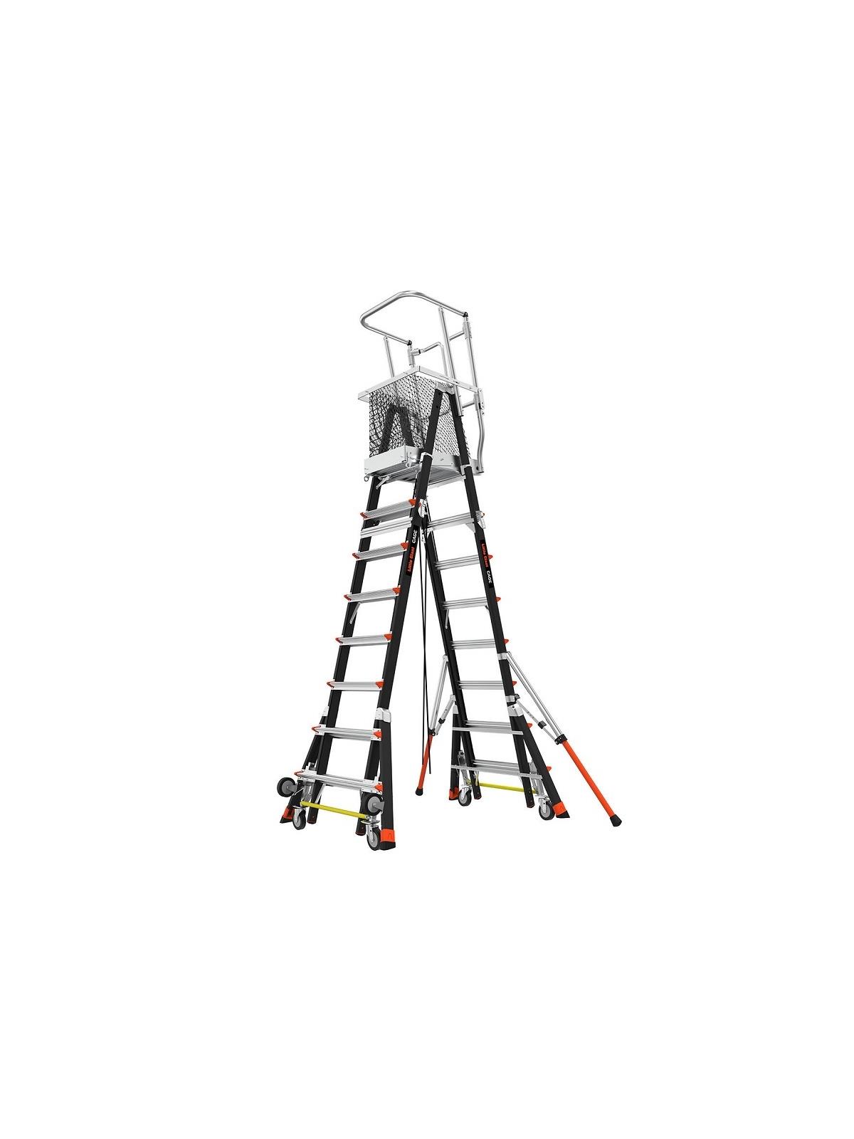 The Cage is constructed of non-conductive, high strength fiberglass-resin composite and is fully adjustable in one-foot increments, allowing the operator to adjust the platform height to the job at hand. Each side adjusts independently, so operators can also use the Cage over uneven surfaces or stairs, where a mechanical lift or ordinary stepladder could never go. The Cage protects operators in a fully enclosed working platform, allowing them to work safely and quickly with two hands while complying with industry regulations. Time and energy saving Tip & Glide™ Wheels make it quick and easy to move from job to job. Type IAA ANSI Duty rating 377 lb. weight capacity. FOB Shipping Point.