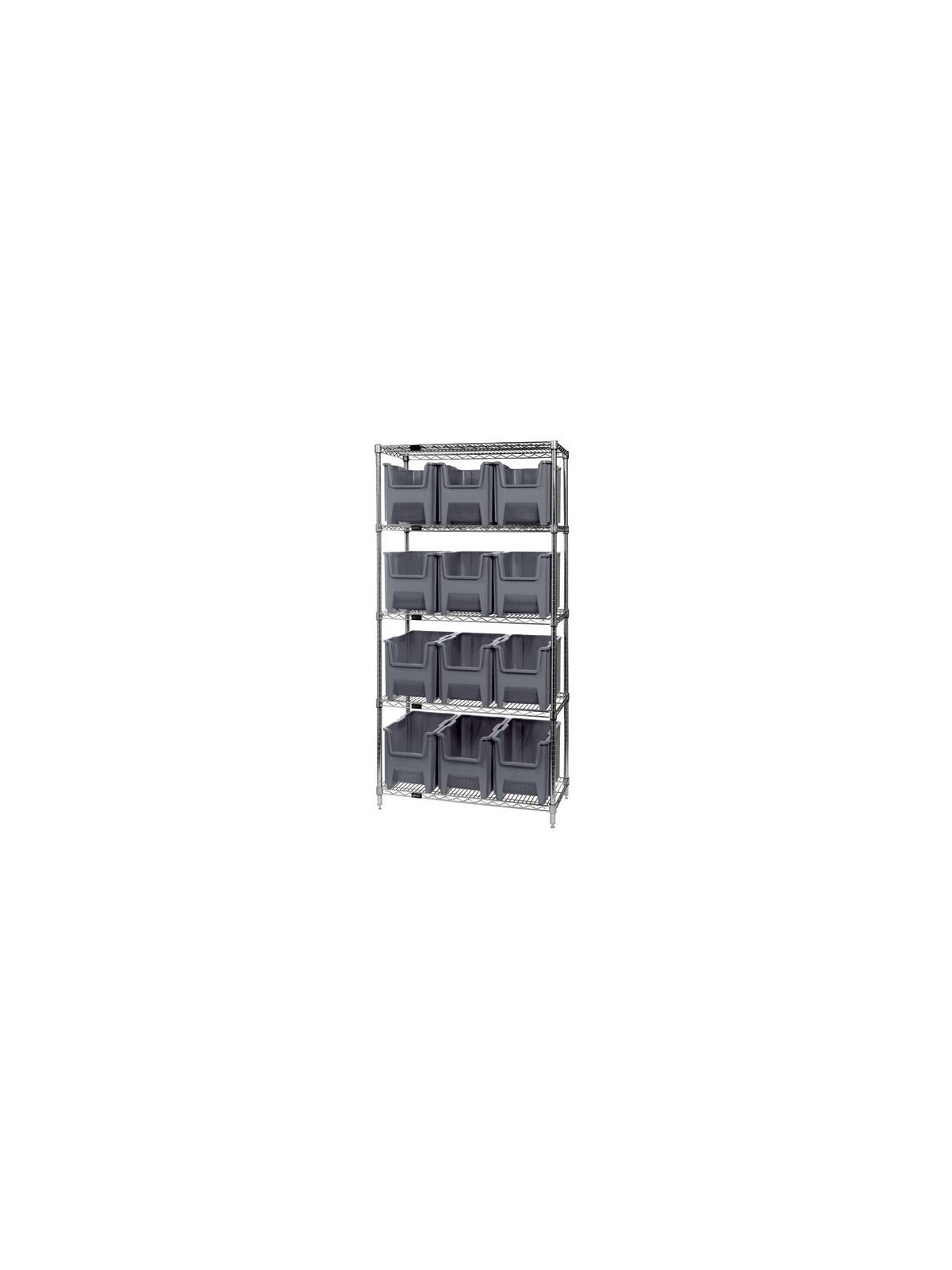 Combine stylish chrome shelving and parts organizing bins. Sturdy shelving unit supports loads up to 800 lbs. Choice of bins. Easy to assemble. Giant Hopper Bins are available in Gray, Blue, or Red. FOB Shipping Point.