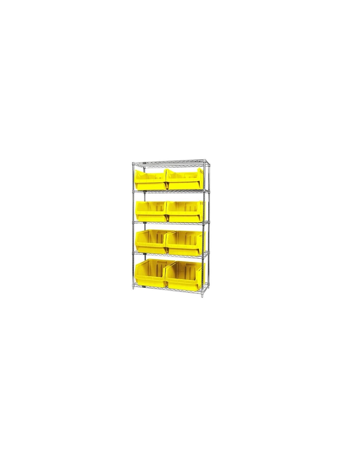 Combine stylish chrome shelving and parts organizing bins. Sturdy shelving unit supports loads up to 800 lbs. Choice of bins. Easy to assemble. Magnum Bins are available in Blue, Yellow, Green, Red, or Black. FOB Shipping Point.
