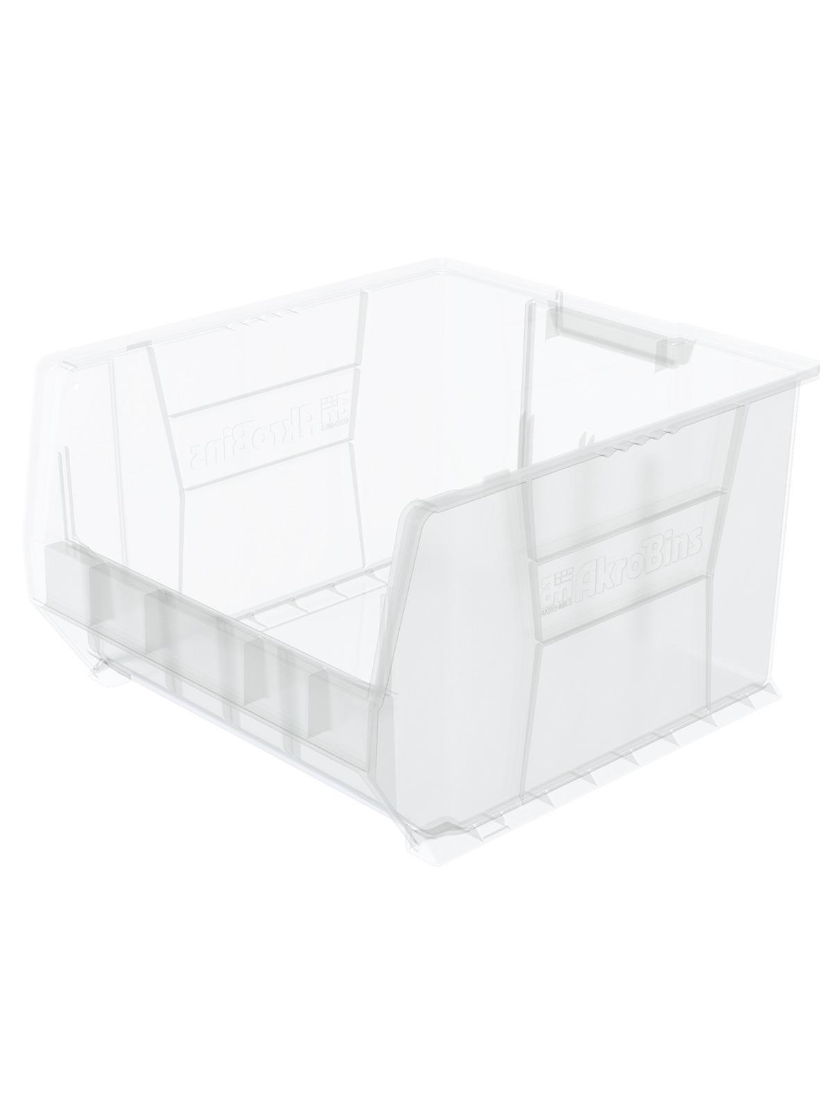 20", 24" and 30" Deep Clear Bins for Super-Size Storage. Large capacity storage bins for organizing heavy or bulky items. Heavy-duty bins molded in clear polypropylene. Extra large stacking containers feature anti-slide stop to prevent bins from shifting forward. Reinforced side ribs add strength and prevent spreading when stacked or loaded. Optional lids and dividers available. FOB Shipping Point.