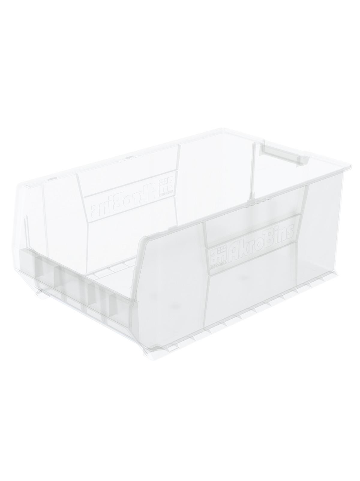 20", 24" and 30" Deep Clear Bins for Super-Size Storage. Large capacity storage bins for organizing heavy or bulky items. Heavy-duty bins molded in clear polypropylene. Extra large stacking containers feature anti-slide stop to prevent bins from shifting forward. Reinforced side ribs add strength and prevent spreading when stacked or loaded. Optional lids and dividers available. FOB Shipping Point.