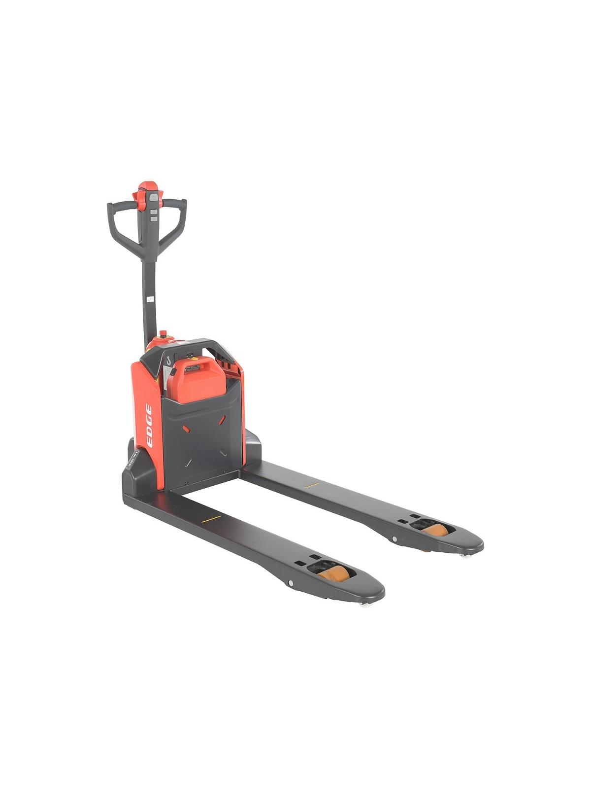 Smart design, high performance, maintenance friendly and compact body design Multi-function handle with integrated PIN code LCD display, emergency reverse, raise-lower buttons, horn, turtle speed button, and forward-reverse butterfly knobs. LCD display features battery charge indicator, operating hour counter, and on-board diagnostic via error code. Unique auto sensor slows down the truck speed by 50% on sharp turns. Unit can operate when handle is in up position. (UP-RIGHT Driving). Equipped with a maintenance free 24V/20Ah lithium ion battery. Battery pack is interchangeable for continuous usage. FOB Shipping Point.
