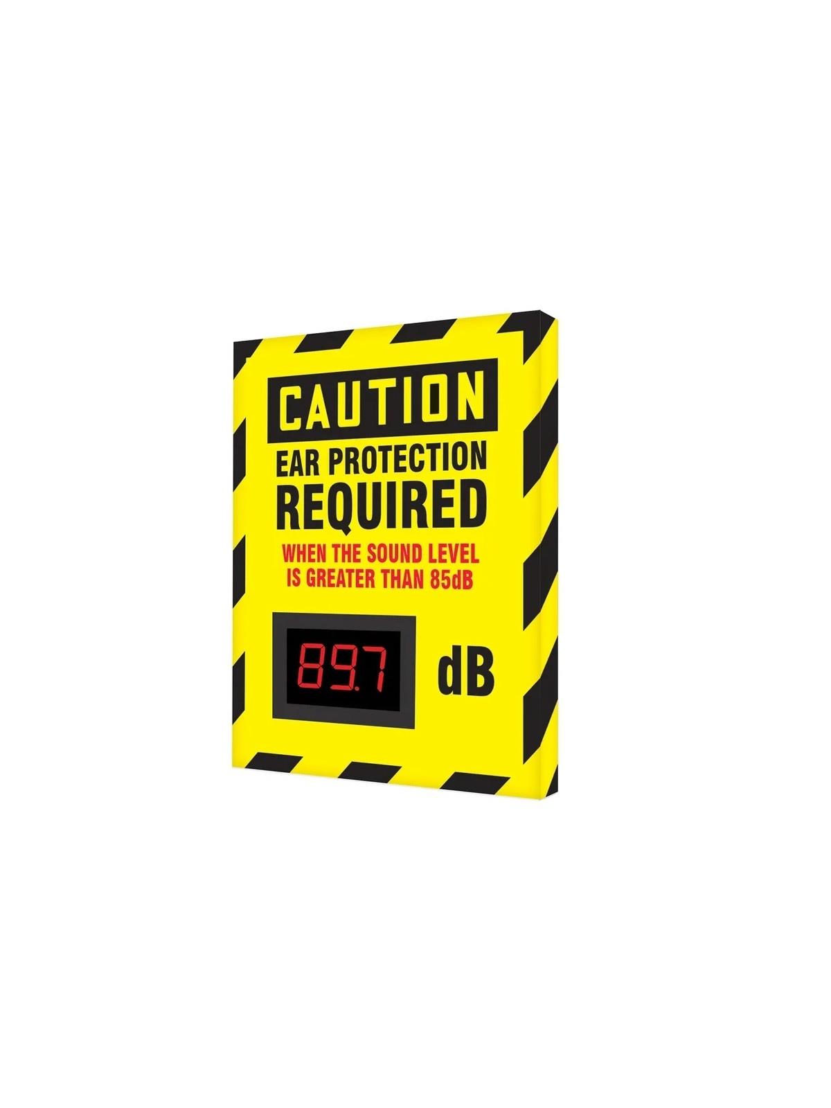 Electronic decibel meter signs constantly measure and display decibel level for employee safety. Encourage workers to use ear protection when sound levels are elevated and become a hazard to them. Striking visual edge safety sign captures employees' attention. Supports OSHA Standard 1910.95 that states employers must have in place an effective hearing conservation program whenever noise exposure equals or exceeds 85 db for 8 hours. FOB Shipping Point.