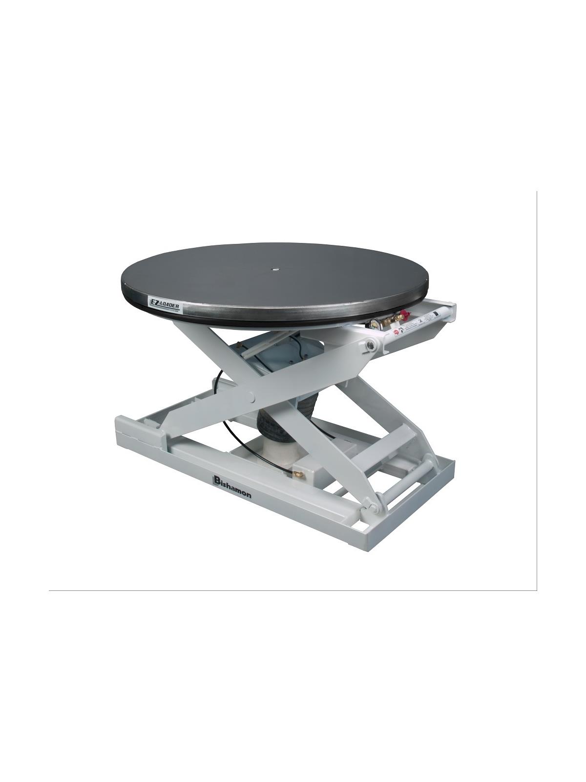 The Bishamon EZ Loader® is a state-of-the-art automatic pallet positioner designed to make loading and unloading faster, safer, and more efficient. Featuring lifting capacities up to 4000 lbs., an integral turntable top, entrapped rollers for stable operation, and hinged maintenance bars for added security, the EZ Loader® sets new standards in ergonomic design. Choose from five models and customize with optional accessories to meet specific needs and applications. Transportable with a forklift or an optional portability kit, the EZ Loader® arrives fully assembled and ready for use. FOB Shipping Point.