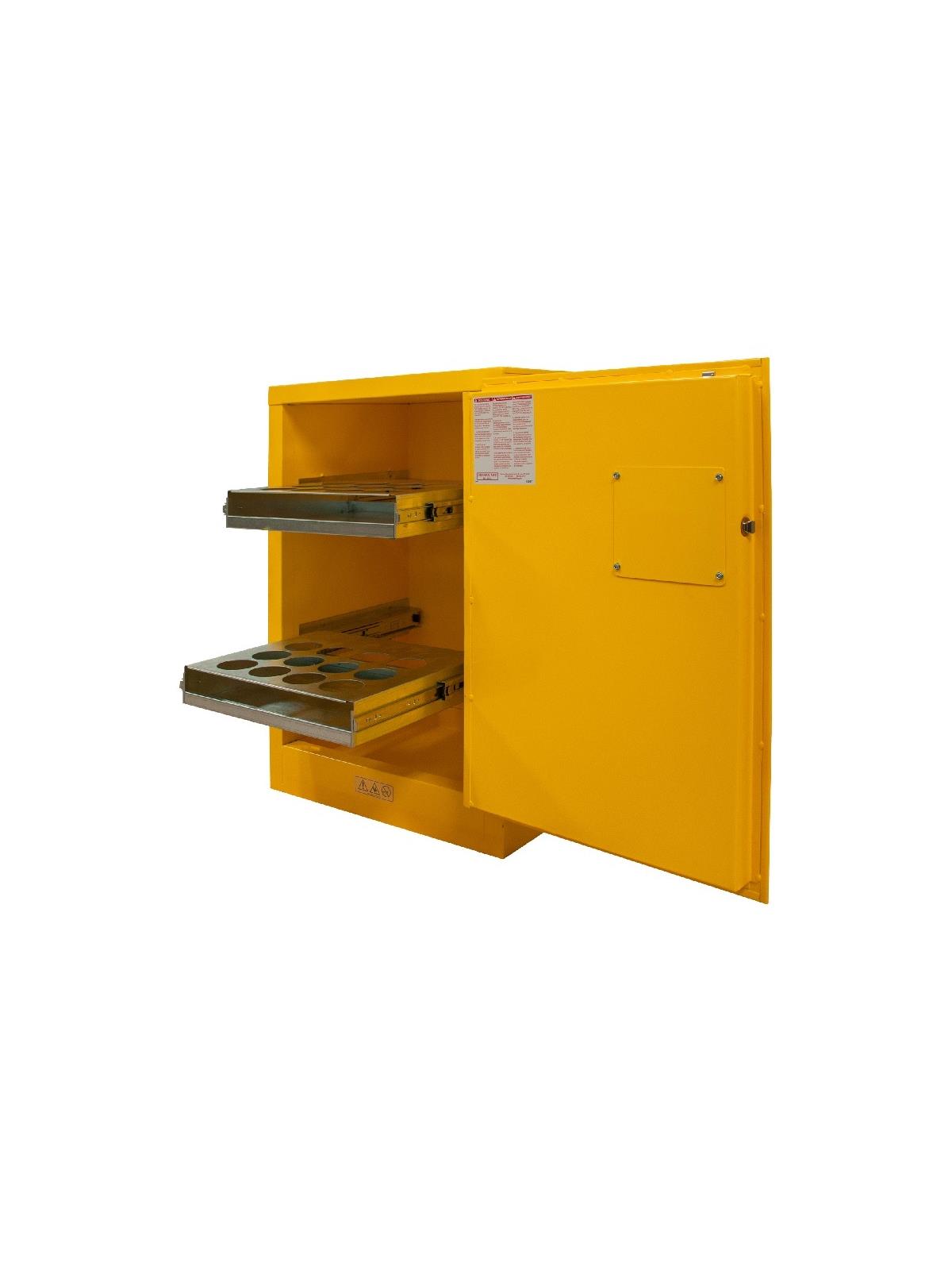 Flammable Storage Cabinets are required by OSHA and UFC in commercial and industrial facilities where flammable liquids are used and stored. Cabinets feature recessed lockable paddle latch and 3 point locking systems which greatly improves security. Bunged air vents on each side of the cabinet allows for greater ventilation. Constructed of all welded Heavy Duty Steel.