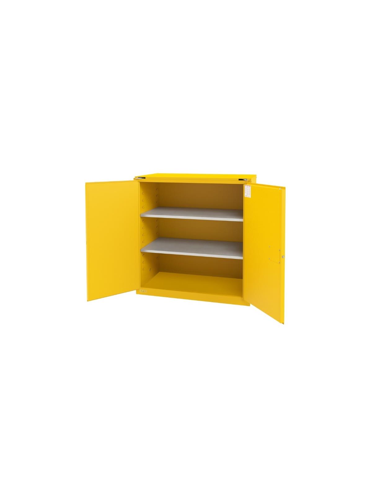 Flammable Storage Cabinets are required by OSHA and UFC in commercial and industrial facilities where flammable liquids are used and stored. Cabinets feature recessed lockable paddle latch and 3 point locking systems which greatly improves security. Bunged air vents on each side of the cabinet allows for greater ventilation. Constructed of all welded Heavy Duty Steel.