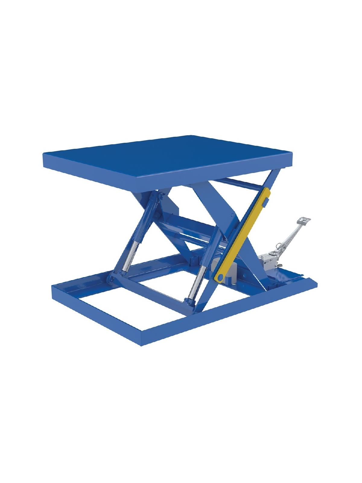Foot Pump Scissor Lift Tables are used by all types of manufacturing and warehousing facilities. Features torsion tubes for side to side stability, pressure flow control valve for controlled lowering, and foot pump. Rugged welded steel construction. Painted blue finish. FOB Shipping Point.
