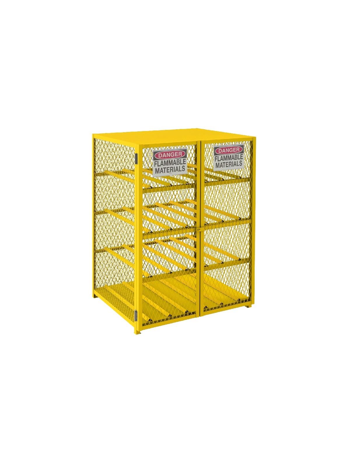 Lockable cabinets store cylinders of fuel, LP gases and other flammable materials on easy-to-access cylinder cradles. "DANGER FLAMMABLE MATERIALS" signs on each door. Magnetic catch keeps doors safely shut when not locked. Heavy-duty butt hinges keep doors from sagging. Includes padlock hasp to secure contents - padlock not furnished. Made of sturdy 1-1/2" x 1/8" angle iron frame. Pre-drilled holes for lagging to floor. Durable, rust and acid resistant safety Yellow powder coat finish. When used properly, units are in full compliance with OSHA and NFPA standards. FOB Shipping Point.