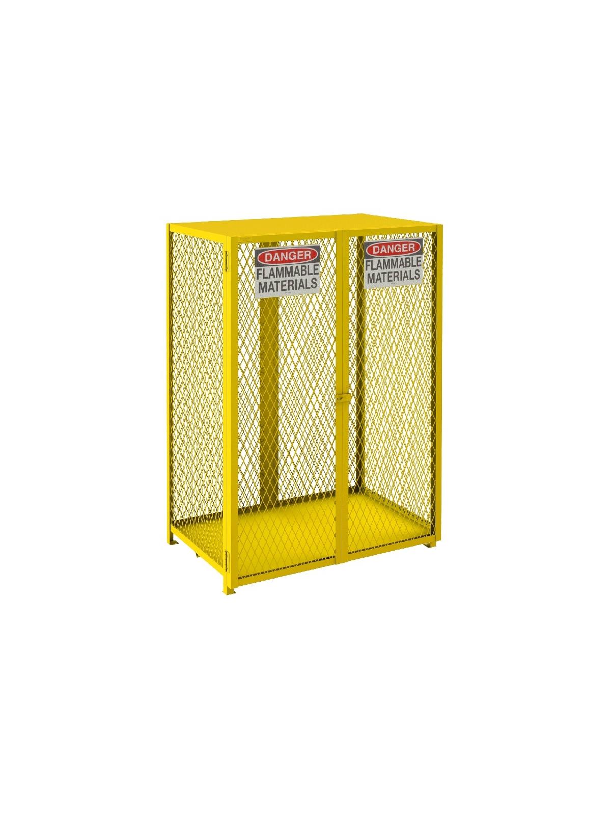 Lockable cabinets store cylinders of fuel, LP gases and other flammable materials on easy-to-access cylinder cradles. "DANGER FLAMMABLE MATERIALS" signs on each door. Magnetic catch keeps doors safely shut when not locked. Heavy-duty butt hinges keep doors from sagging. Includes padlock hasp to secure contents - padlock not furnished. Made of sturdy 1-1/2" x 1/8" angle iron frame. Pre-drilled holes for lagging to floor. Durable, rust and acid resistant safety Yellow powder coat finish. When used properly, units are in full compliance with OSHA and NFPA standards. FOB Shipping Point.