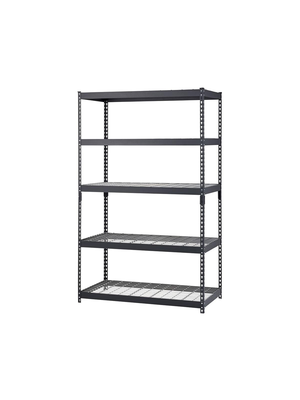 Industrial grade steel construction for lasting use. Five shelf levels with wire decking adjust in 1-1/2" increments to accommodate different size items. Each shelf holds up to 1,000 lbs. weight capacity, when evenly distributed. Wire decking provides air flow and will not chip or rust. Can also be assembled horizontally as two separate work height units. Durable textured black finish. FOB Shipping Point.