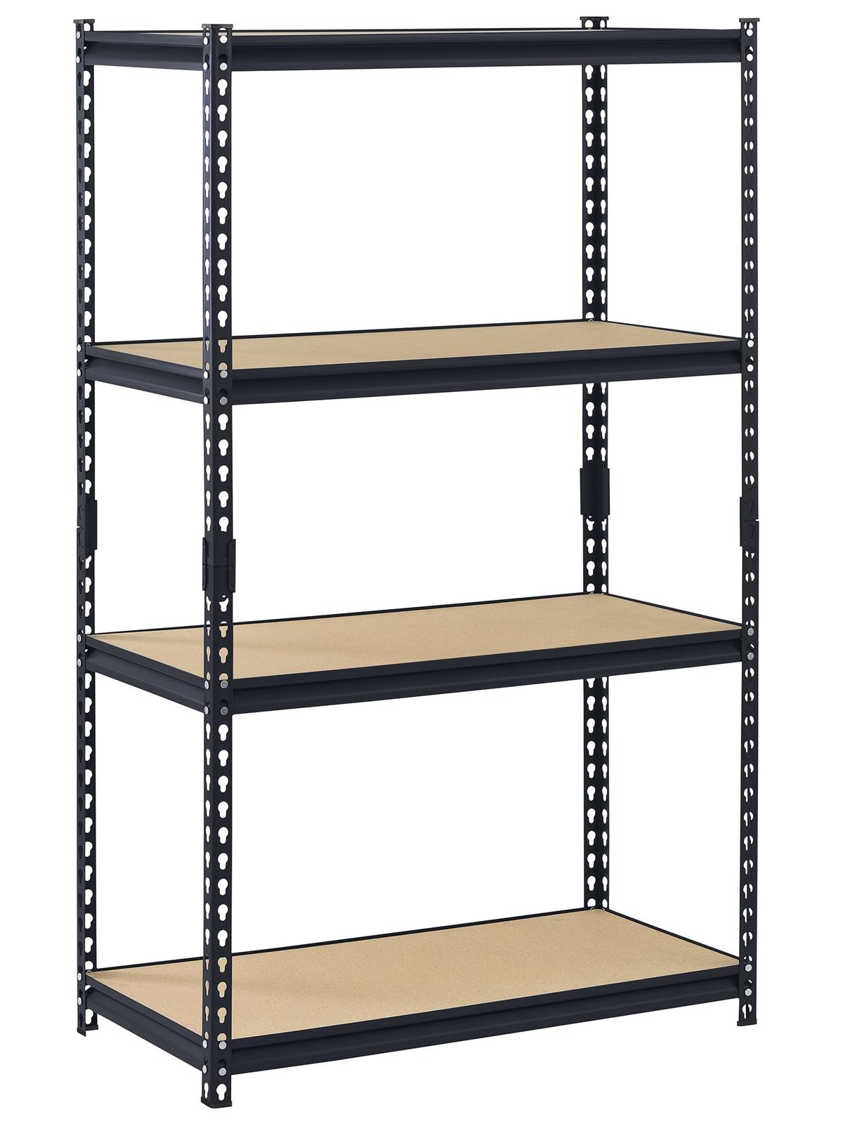 Shelves adjust in 1-1/2" increments to accommodate different size items. Each shelf holds up to 800 lbs. weight capacity, when evenly distributed. Includes particleboard decking. Can also be assembled horizontally as two separate work height units. Durable powder coated black finish. FOB Shipping Point.