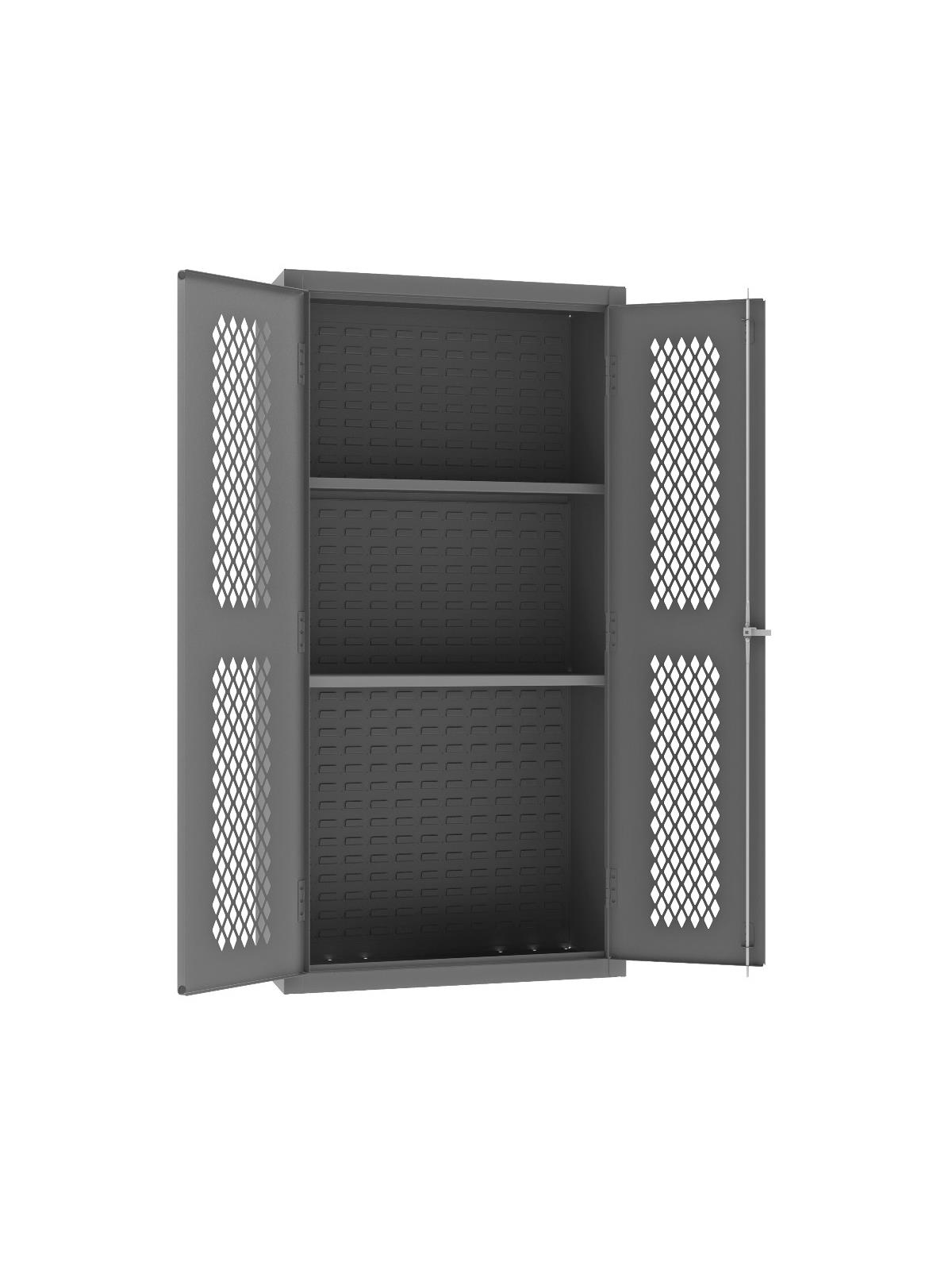 Punched diamond pattern in doors allows content visibility and ventilation. 3-point locking system with keyed handle and lock rods. 4 keys included. Full height, formed and recessed doors with heavy duty, leaf hinges to prevent sagging and warping. Adjustable shelves rest on louvered uprights and adjust on 4" centers (no tools required). Durable, gray, textured powder coat finish. FOB Shipping Point.