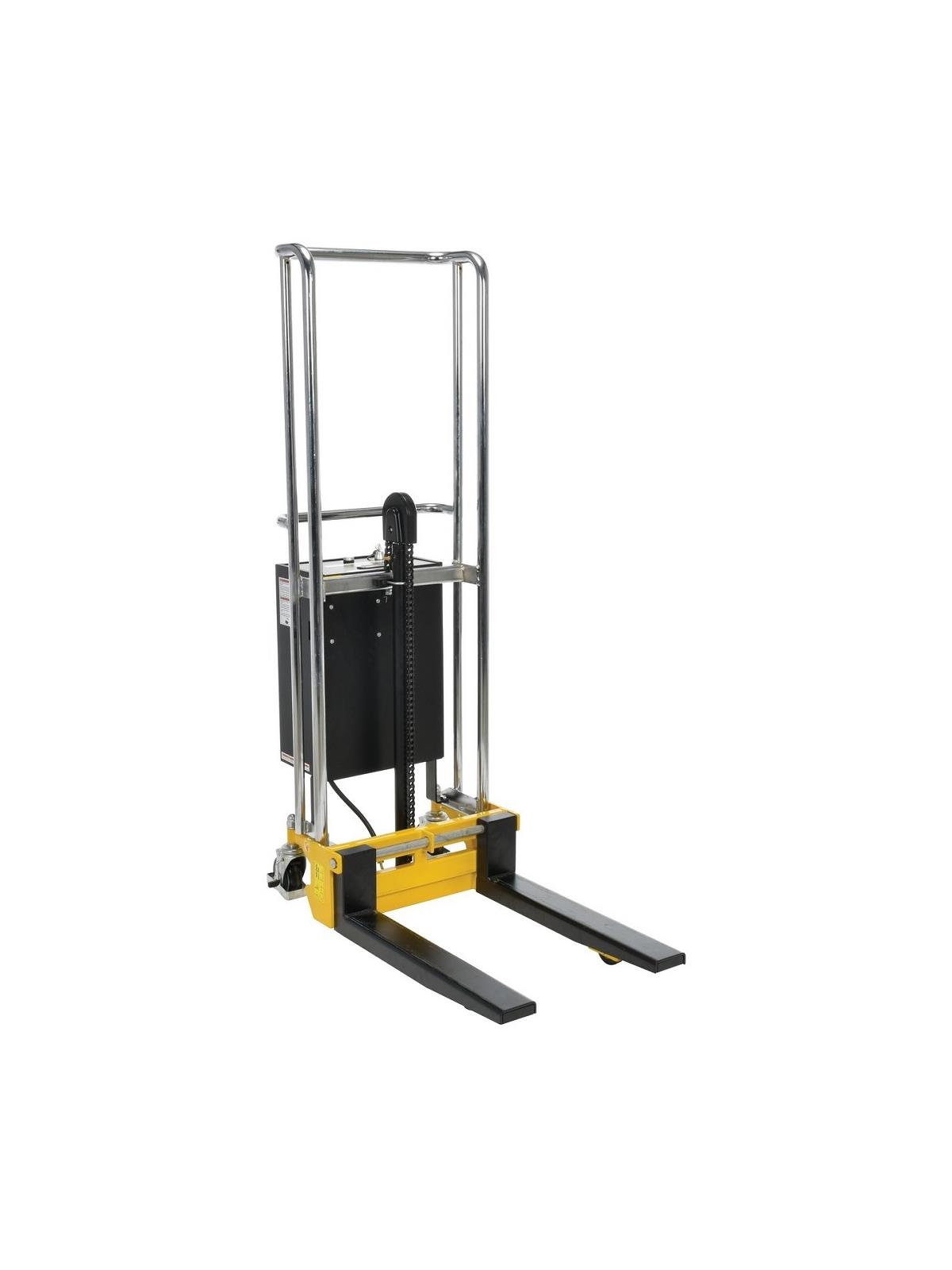 Economical and attractive. Features removable chrome platform for operations requiring forks. Manual hydraulic pump mechanism yields 3/4" of platform travel per stroke. Non-slip chain is used for accurate positioning. Units roll easily on 2 rigid, 2 swivel polyurethane casters and includes a foot operated brake for extra safety. All welded steel construction with chrome platform and uprights. Forks measure 4-3/8"W. x 2-1/2"H. -- fork length is same as platform length. Not for use with pallets. FOB Shipping Point.