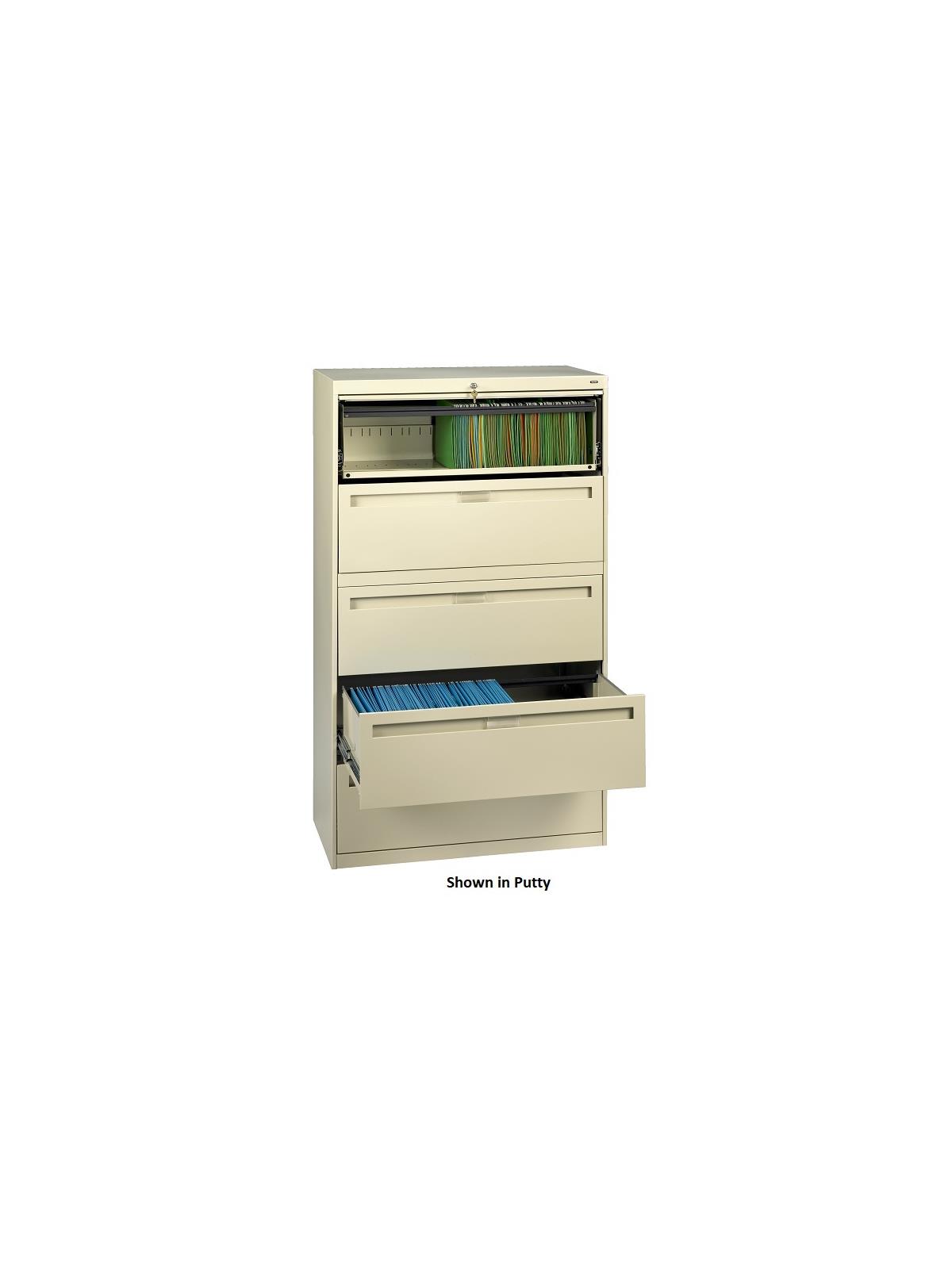 Drawers and doors have easy grip, full-width pulls with recessed label holders. Four leveling glides allow the unit to be leveled on uneven floors. To reduce risk of tipping, order two drawer lateral files with counterweights (suffix "W") for all applications except under a work surface in a workstation. Five and six-high units have retractable door(s) with roll-out drawer on top opening(s). Durable powder-coat paint finish. Available in Light Gray, Medium Gray, Putty, Sand and Black. FOB Shipping Point.