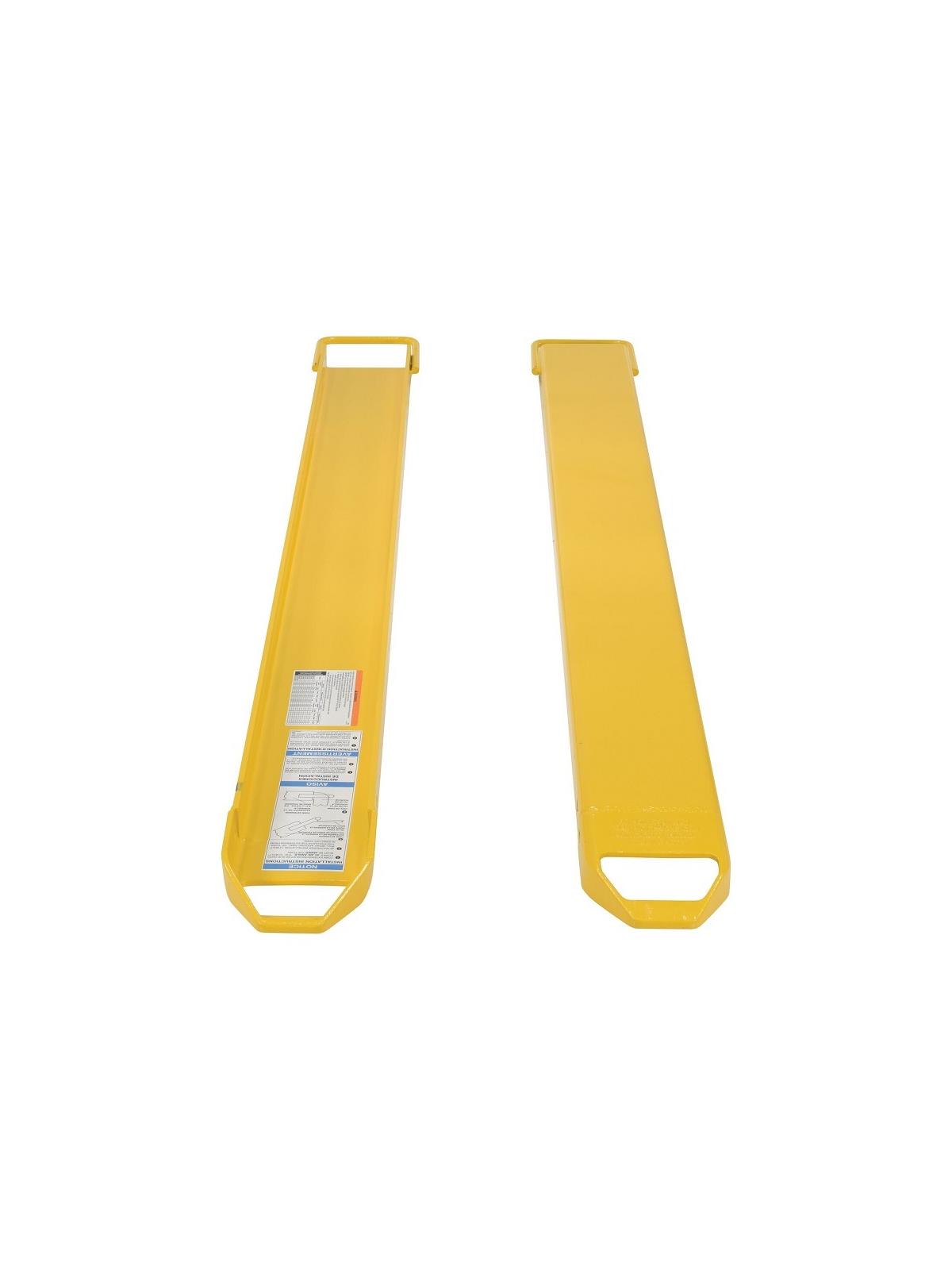 Rugged and durable welded steel construction with cast steel fork tips. Steel retaining strap prevents fork extensions from sliding off forks during use. Extensions are put on by sliding them up the fork at a 45° angle. OSHA regulations require that extensions are no more than 150% of the existing fork length. Powder coat Yellow finish. FOB Shipping Point.
