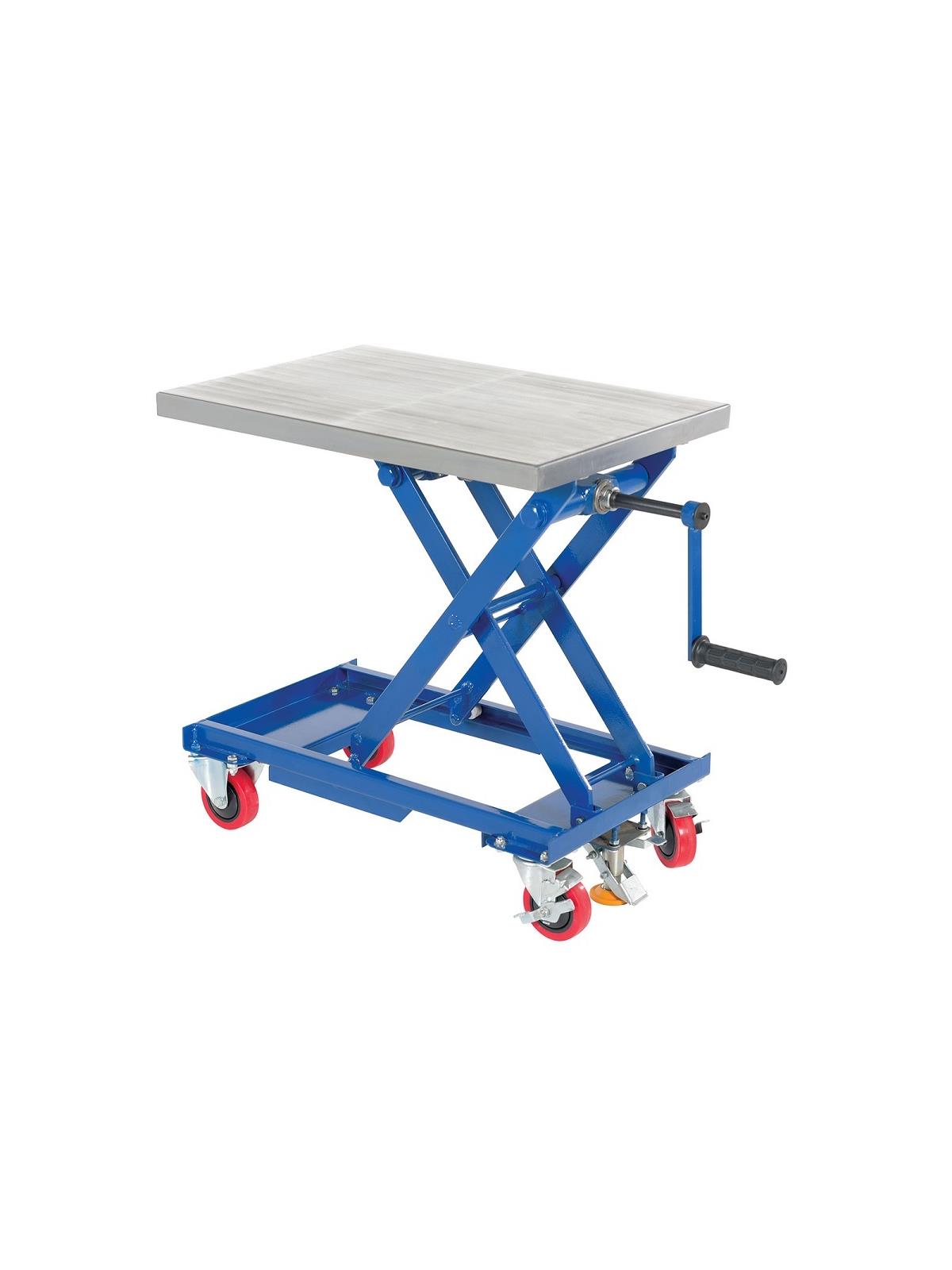 Raise and lower material quickly and easily with Mechanical Scissor Carts. Carts roll smoothly on two rigid and two swivel poly-on-poly caster. Mechanical screw drive provides precise positioning with no downward drift. The partially stainless steel cart features a stainless steel platform. Frame, handle, caster rigs and hardware are zinc plated. Crank assembly and scissor legs are painted. FOB Shipping Point.