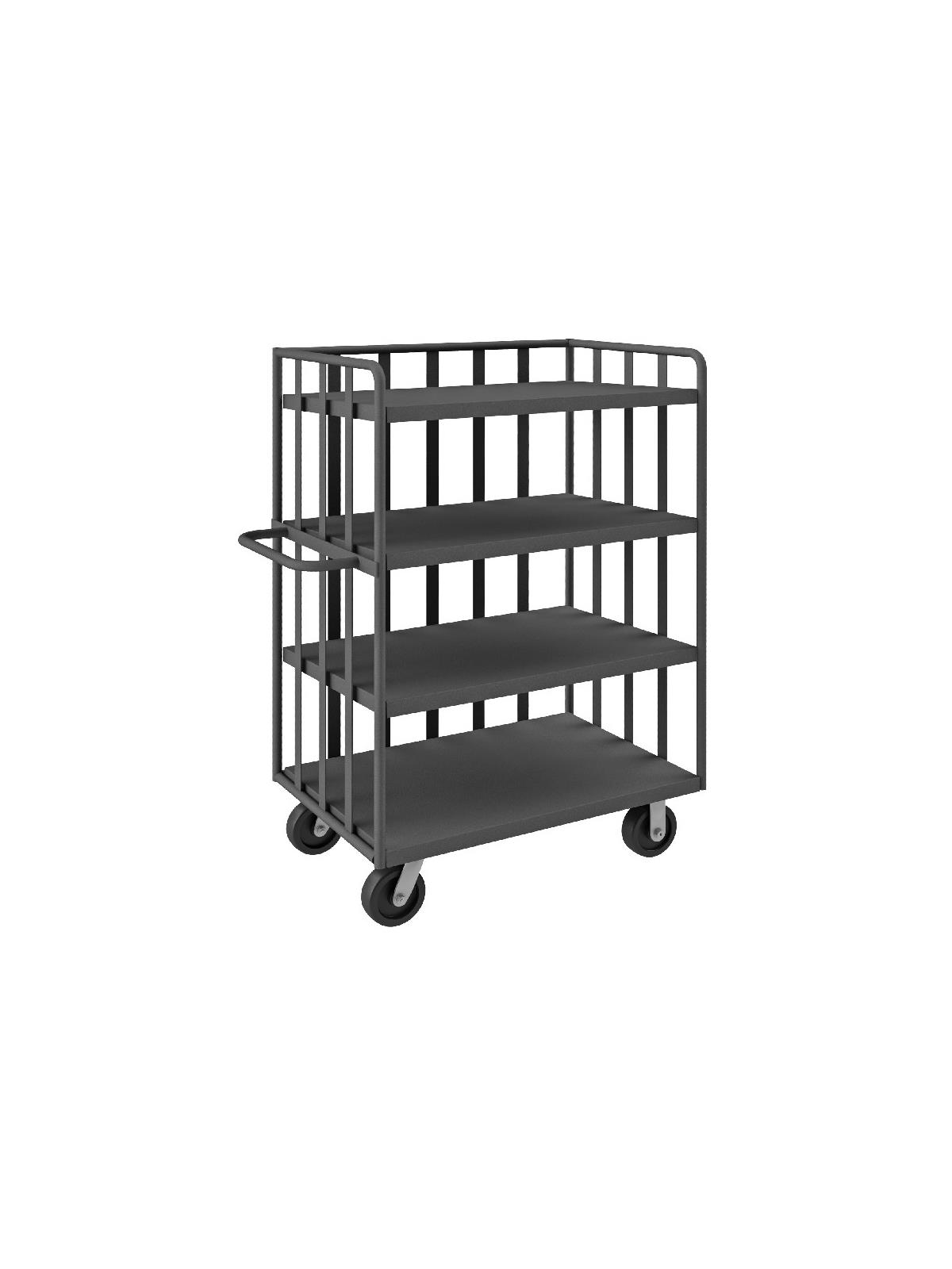 Built for heavy 2000 lb. loads. Frame is made from 1" steel tubing. 1/2" rods on sides and back. 14" clearance between shelves. Steel shelves slope 1" from front to rear preventing contents from falling off during transport Shelves are made of 14 ga. steel. Smooth rolling 6" x 2" phenolic bolt-on casters, 2 swivel, 2 rigid. All units are 58"H. Gray powder coat finish. FOB Shipping Point.