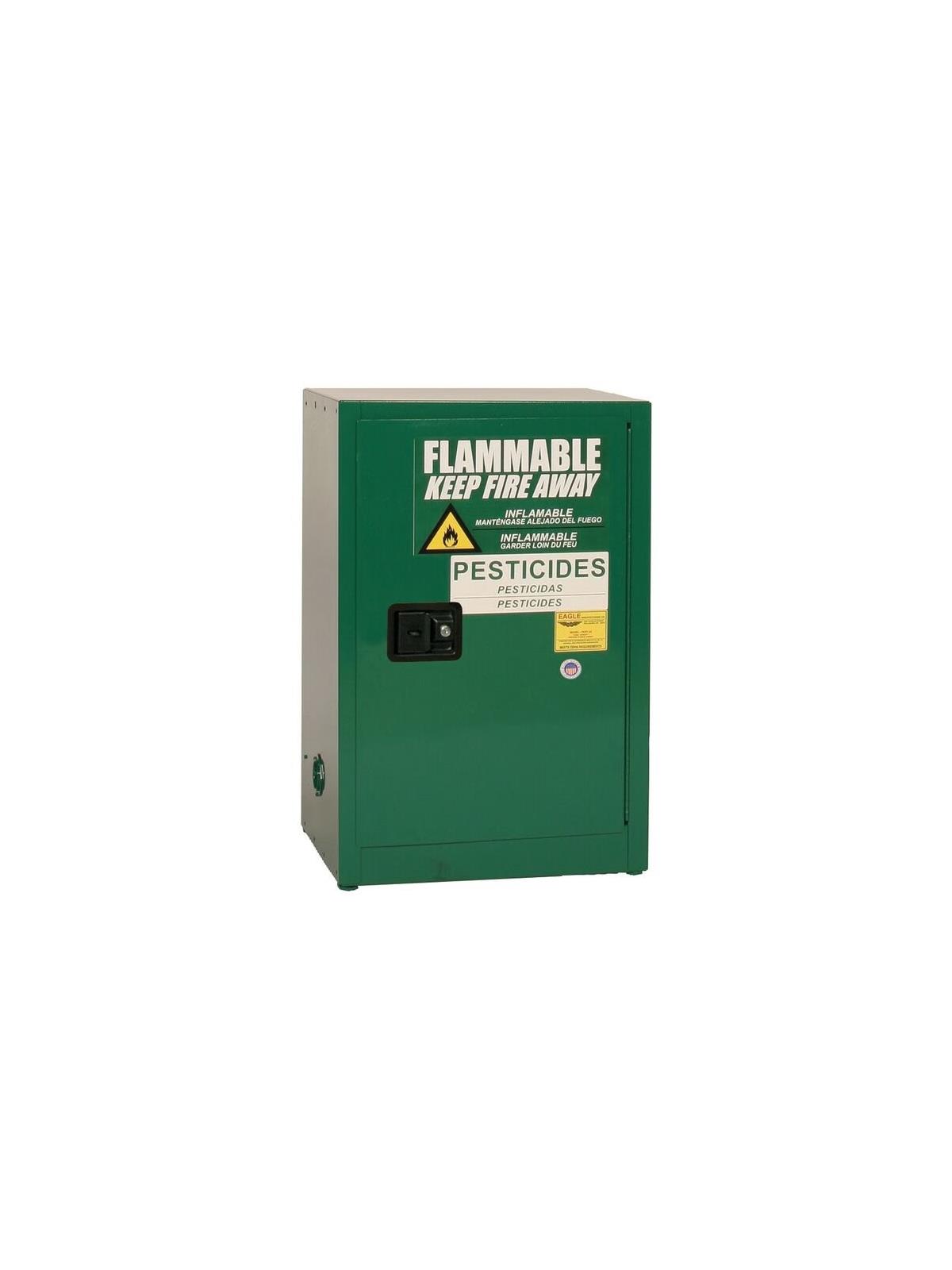 Eagle safety pesticide cabinets provide needed security for companies specializing in lawn care, golf course management, agricultural interests, and individuals who handle and store pesticides and poisons. The pesticide safety cabinets are constructed of 18-gauge steel and feature reinforced double-wall construction with air space on sides, top, bottom, back, and doors. The cabinets are coated with a lead-free, high gloss, baked-on powder finish for superior protection against chemical corrosion with large FLAMMABLE- KEEP FIRE AWAY and pesticide labels. All of our durable pesticide cabinets are FM-Approved and meet NFPA Code 30 and OSHA requirements. FOB Shipping Point.