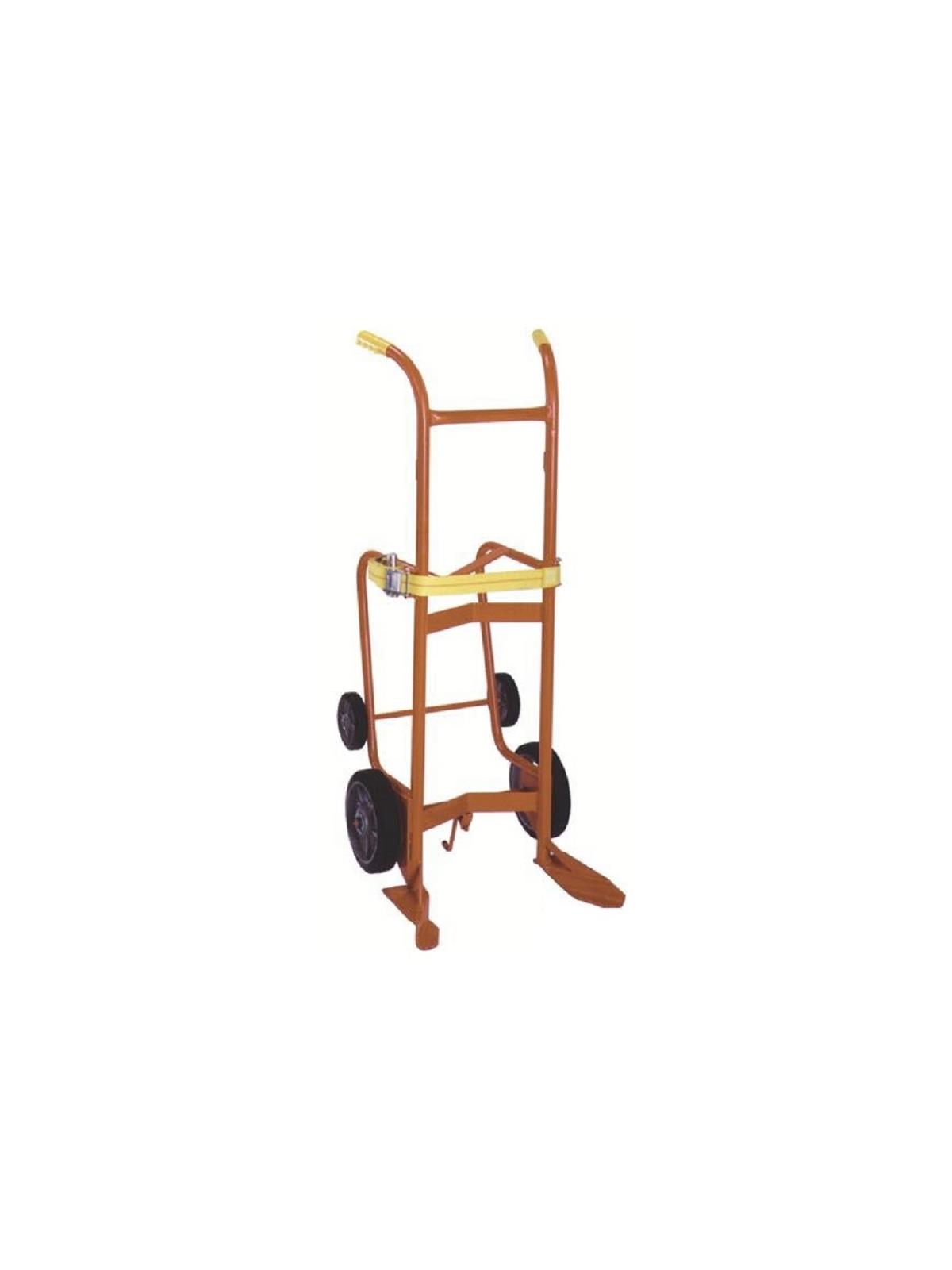 A) Standard Poly Drum Truck Handles all poly and fiber drums except overpacks. Features replaceable "feet" and belt. Wide "feet" and belt eliminate the risk of drums being punctured by nose prongs and chime hooks. Floating axle reduces effort required to break over and balance the load. 23.5"D. Patented design.