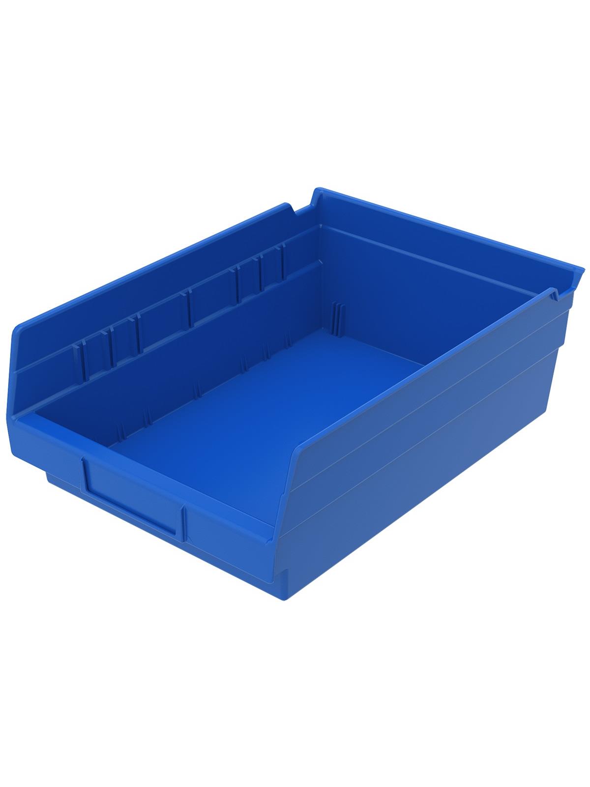 Outlasts corrugated bins - pays for themselves in reduced replacement costs. One-piece construction is waterproof and unaffected by grease or oil. Works with 12", 18" and 24" deep shelving, or vertical storage and retrieval units. Labels available. Available in 22 sizes and five colors - Red, Yellow, Blue, Green, or Semi-Clear. FOB Shipping Point.
