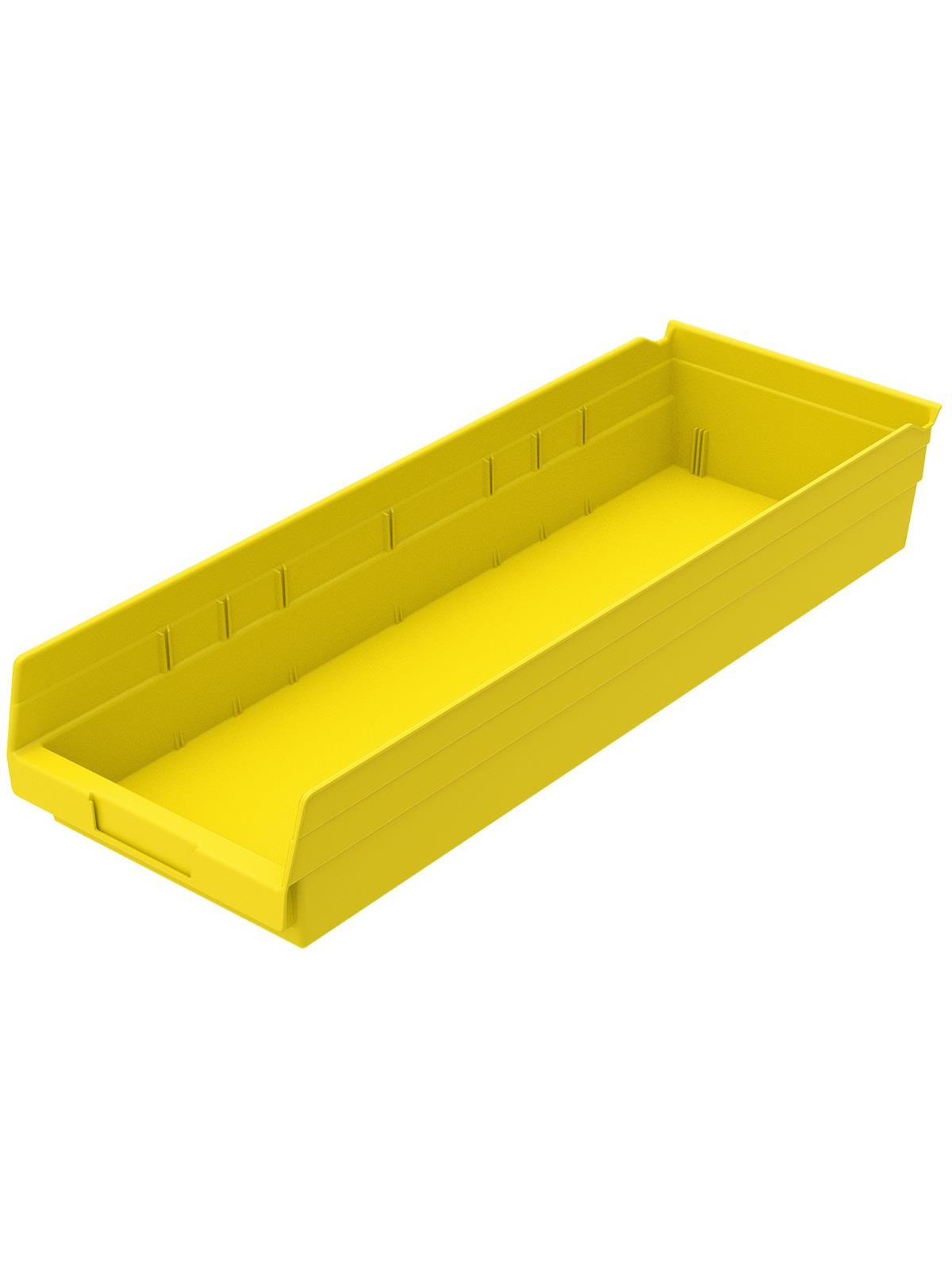 Outlasts corrugated bins - pays for themselves in reduced replacement costs. One-piece construction is waterproof and unaffected by grease or oil. Works with 12", 18" and 24" deep shelving, or vertical storage and retrieval units. Labels available. Available in 22 sizes and five colors - Red, Yellow, Blue, Green, or Semi-Clear. FOB Shipping Point.