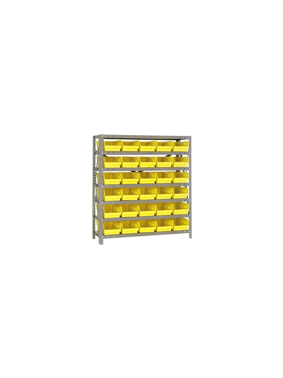 Rugged 350 lb. capacity per shelf, standard shelving unit will keep parts organized and readily accessible. Gray enamel finish will not rust or corrode. 12-HQSB100, 8-HQSB101, 5-HQSB102, 4-HQSB107, 3-HQSB109 fit across a standard 36"W x 12"D shelf. 8-HQSB103, 5-HQSB104, 4-HQSB108, 3-HQSB110 fit across a 36"W x 18"D shelf. Bins are available in Blue, Yellow, Red, Green, Ivory or Black. FOB Shipping Point.