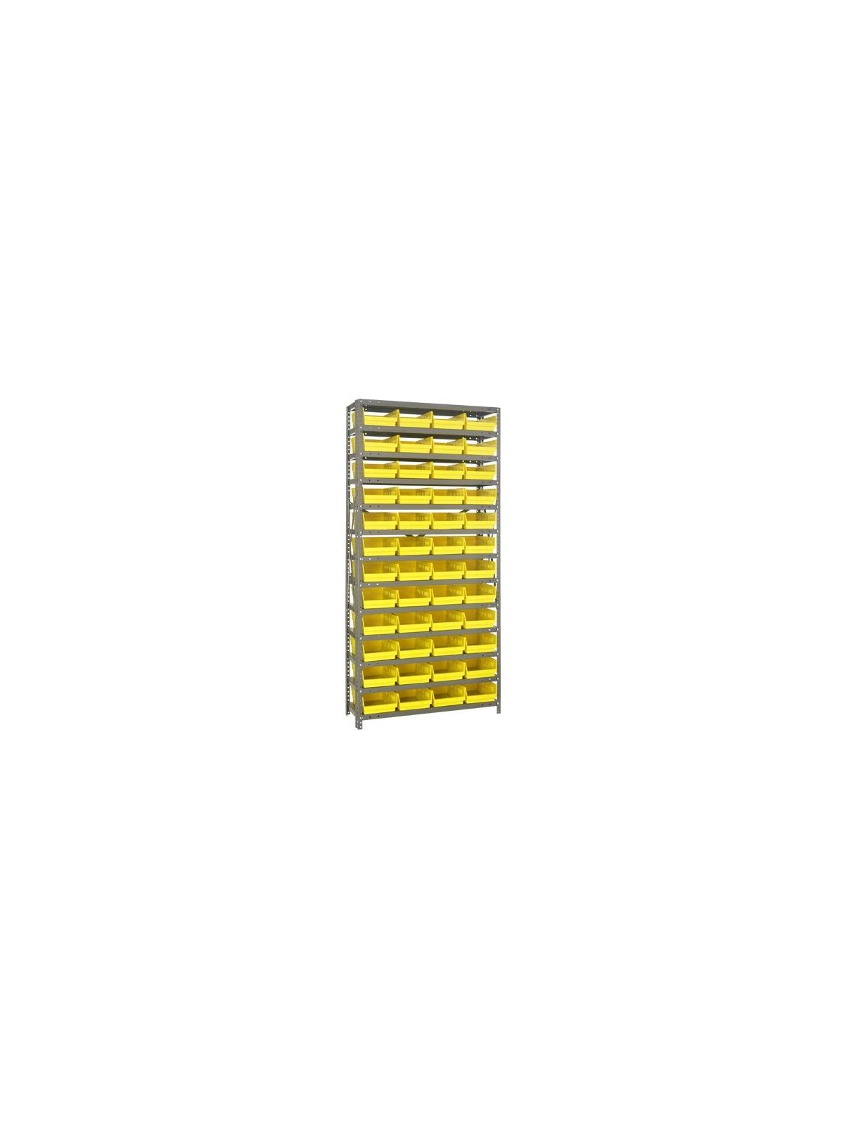 Rugged 350 lb. capacity per shelf, standard shelving unit will keep parts organized and readily accessible. Gray enamel finish will not rust or corrode. 12-HQSB100, 8-HQSB101, 5-HQSB102, 4-HQSB107, 3-HQSB109 fit across a standard 36"W x 12"D shelf. 8-HQSB103, 5-HQSB104, 4-HQSB108, 3-HQSB110 fit across a 36"W x 18"D shelf. Bins are available in Blue, Yellow, Red, Green, Ivory or Black. FOB Shipping Point.