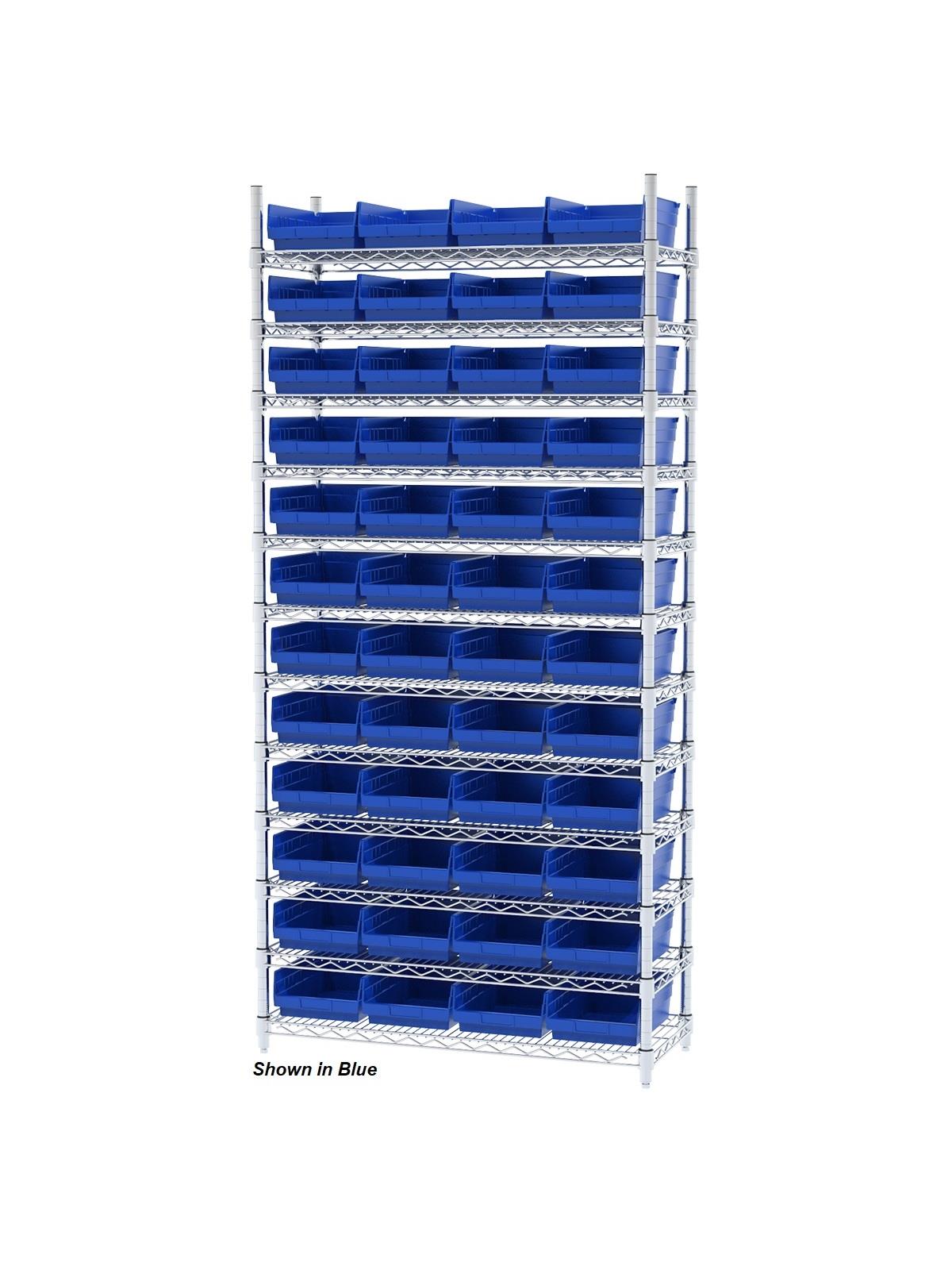 Shelf Bin Wire Systems can be configured for use with 36, 48, 60 or 96 bins providing a versatile system for storage and material handling. Durable and strong polypropylene shelf bins outlast corrugated bins. Bins available in Blue, Red, Yellow, or Semi-Clear. FOB Shipping Point.