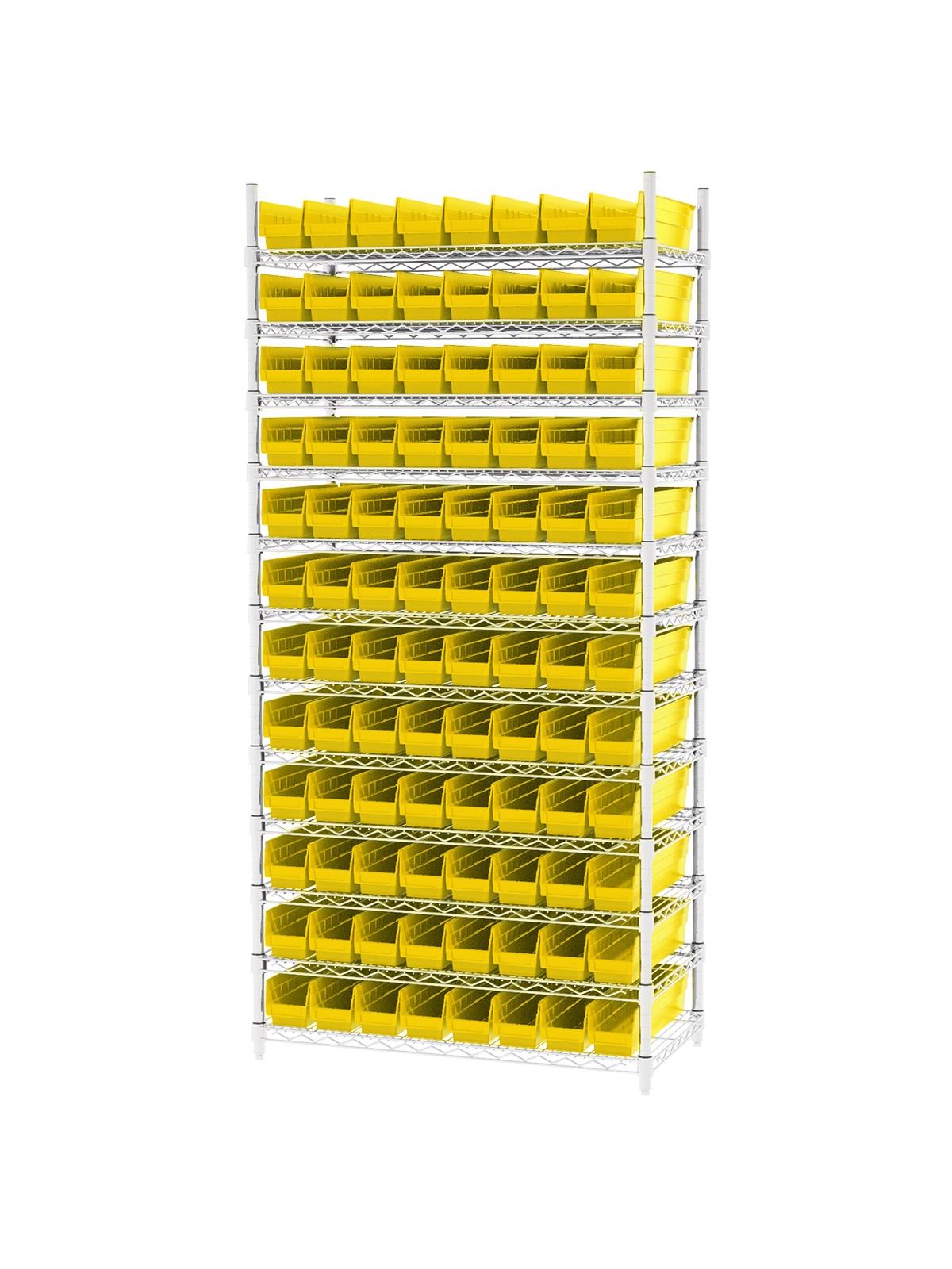 Shelf Bin Wire Systems can be configured for use with 36, 48, 60 or 96 bins providing a versatile system for storage and material handling. Durable and strong polypropylene shelf bins outlast corrugated bins. Bins available in Blue, Red, Yellow, or Semi-Clear. FOB Shipping Point.