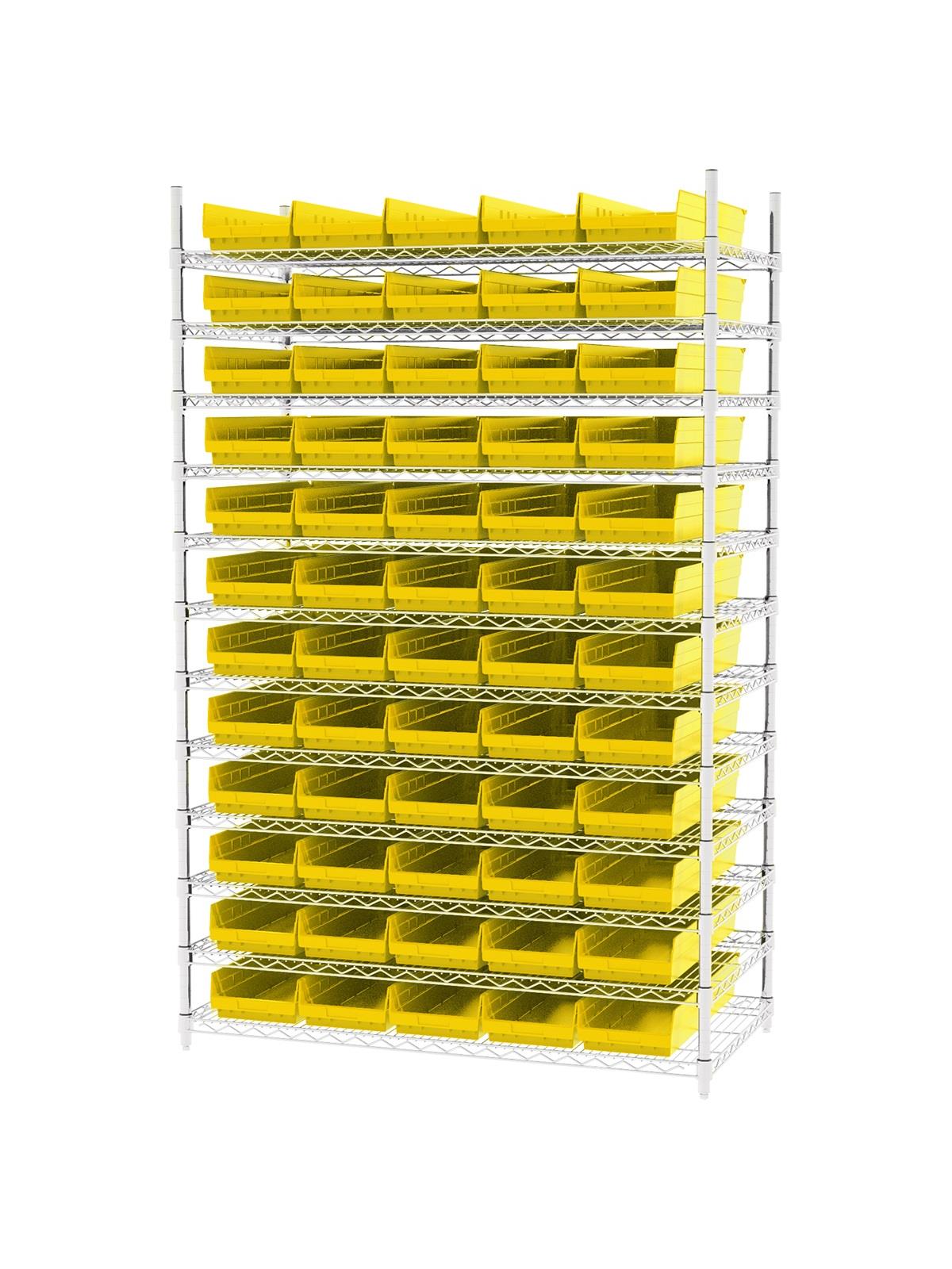 Shelf Bin Wire Systems can be configured for use with 36, 48, 60 or 96 bins providing a versatile system for storage and material handling. Durable and strong polypropylene shelf bins outlast corrugated bins. Bins available in Blue, Red, Yellow, or Semi-Clear. FOB Shipping Point.