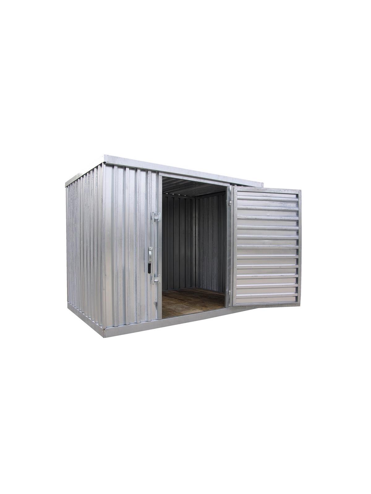 Modular Storage Buildings are ideal for keeping valuable items secure. Constructed of maintenance free galvanized corrugated paneling. The door measures 45"W x 74"H usable and features a right-side hinged lock (padlock not included). Modular design is easy to assemble. Once assembled, unit can be moved with a fork lift. Each unit features a wooden floor 5-3/4" high to help keep products dry. Built-in rain gutters for water drainage is standard. FOB Shipping Point.