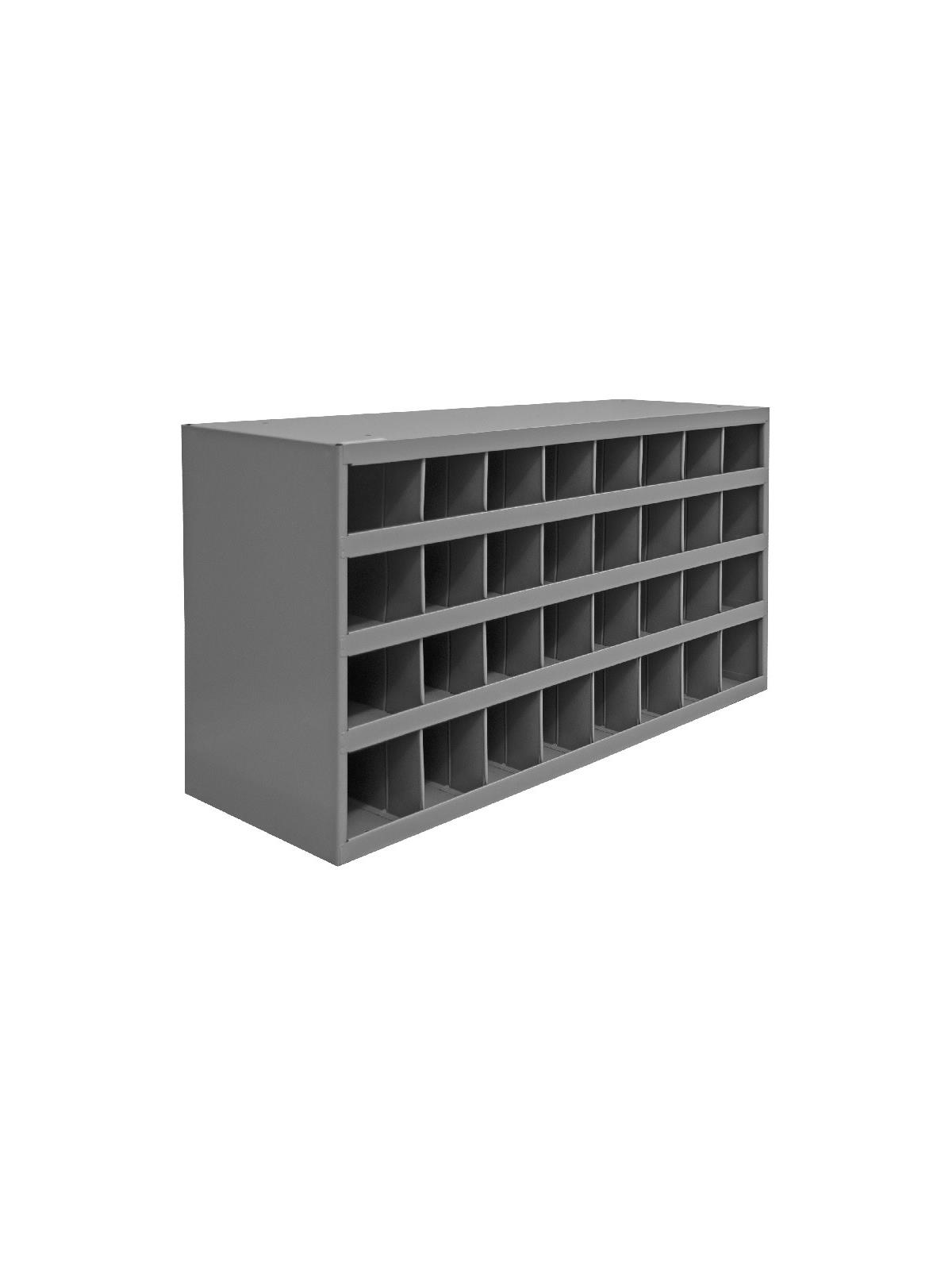Roll-formed sides for increased strength and stability. Newly redesigned slope shelves. Ribbed and hemmed dividers provide added strength. Optional base available. Ships fully assembled ready for use. Durable gray powder coat finish. FOB Shipping Point.