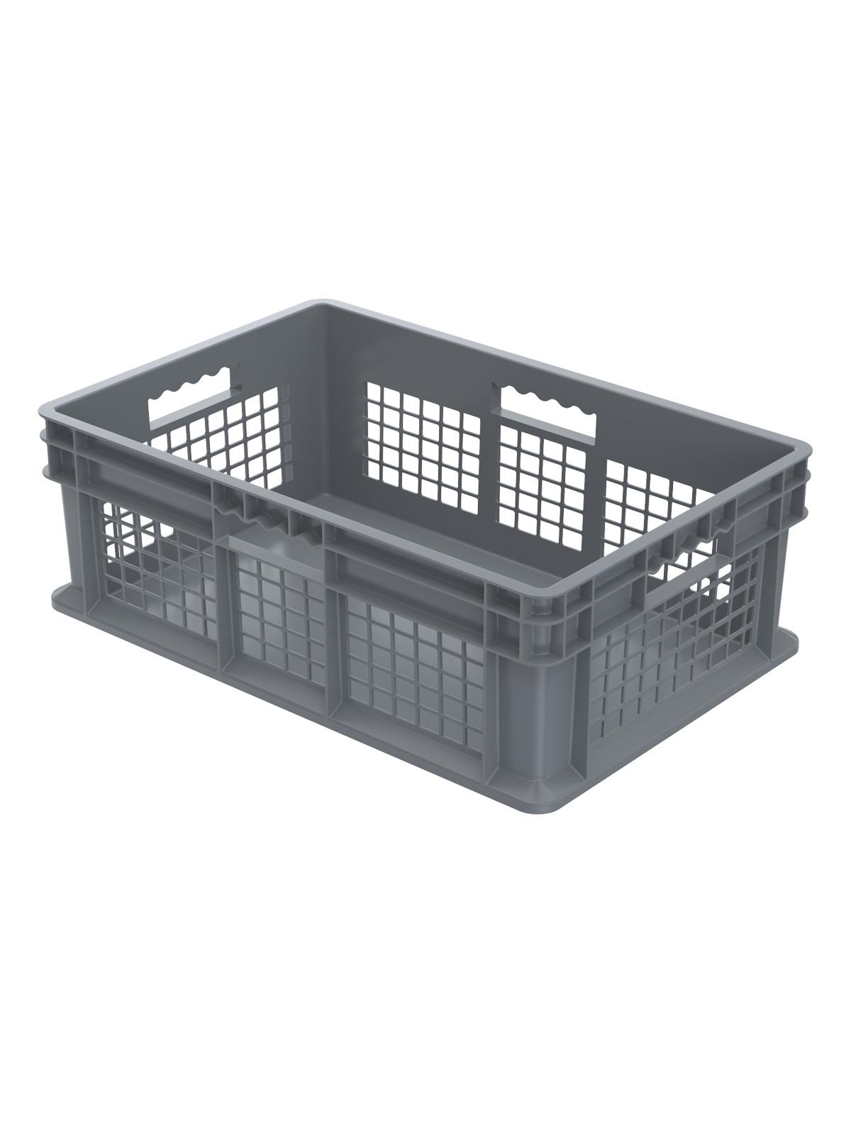 These straight wall containers have smooth inner walls that make cleaning easy and sanitary. The mesh sides allow excellent hot or cold air ventilation. Manufactured from injection-molded high-density polyethylene. Available in 4 sizes and 3 styles. Gray in color. FOB Shipping Point.