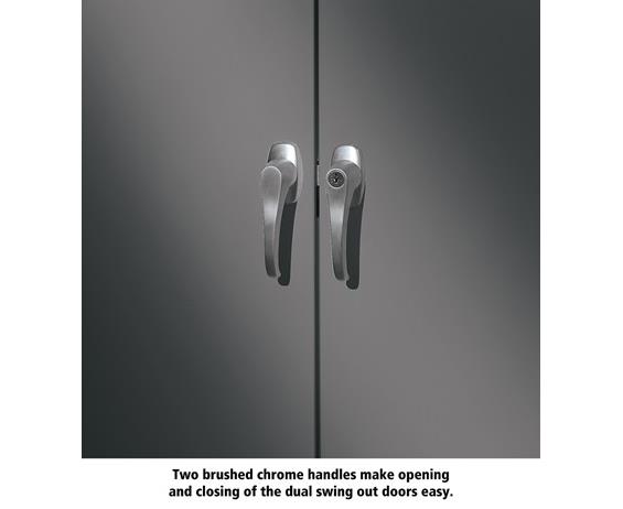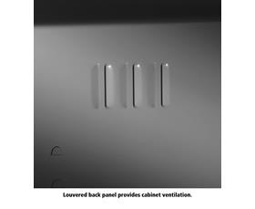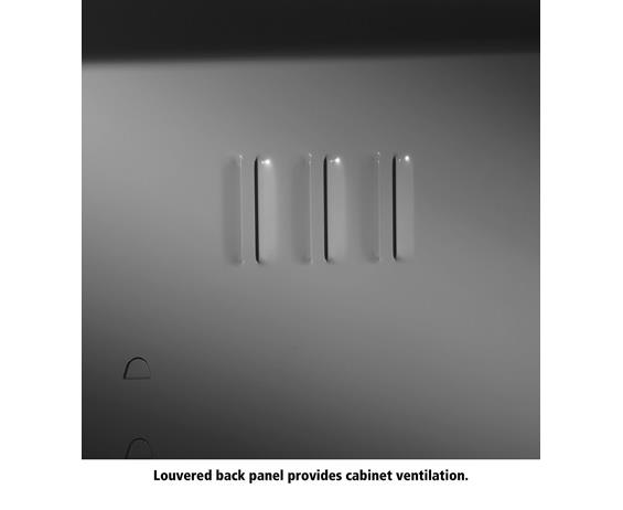 Knuckle hinges on each door insure the integrity of the cabinet and the alignment of the doors. Doors are reinforced for strength and quietness. Handle on right-hand door activates a 3-point system for added security; dummy handle on left-hand door. Shelves are adjustable in 2" increments on built-in shelf tabs. Shelves will hold up to 200 lbs. evenly distributed. Two front leveling glides compensate for uneven floors. Louvered back panel allows air circulation in the cabinet. Available in four models--storage, wardrobe, combination, and counter high cabinets. Available in Black, Champagne/Putty, Sand, Light Gray and Medium Gray. FOB Shipping Point.