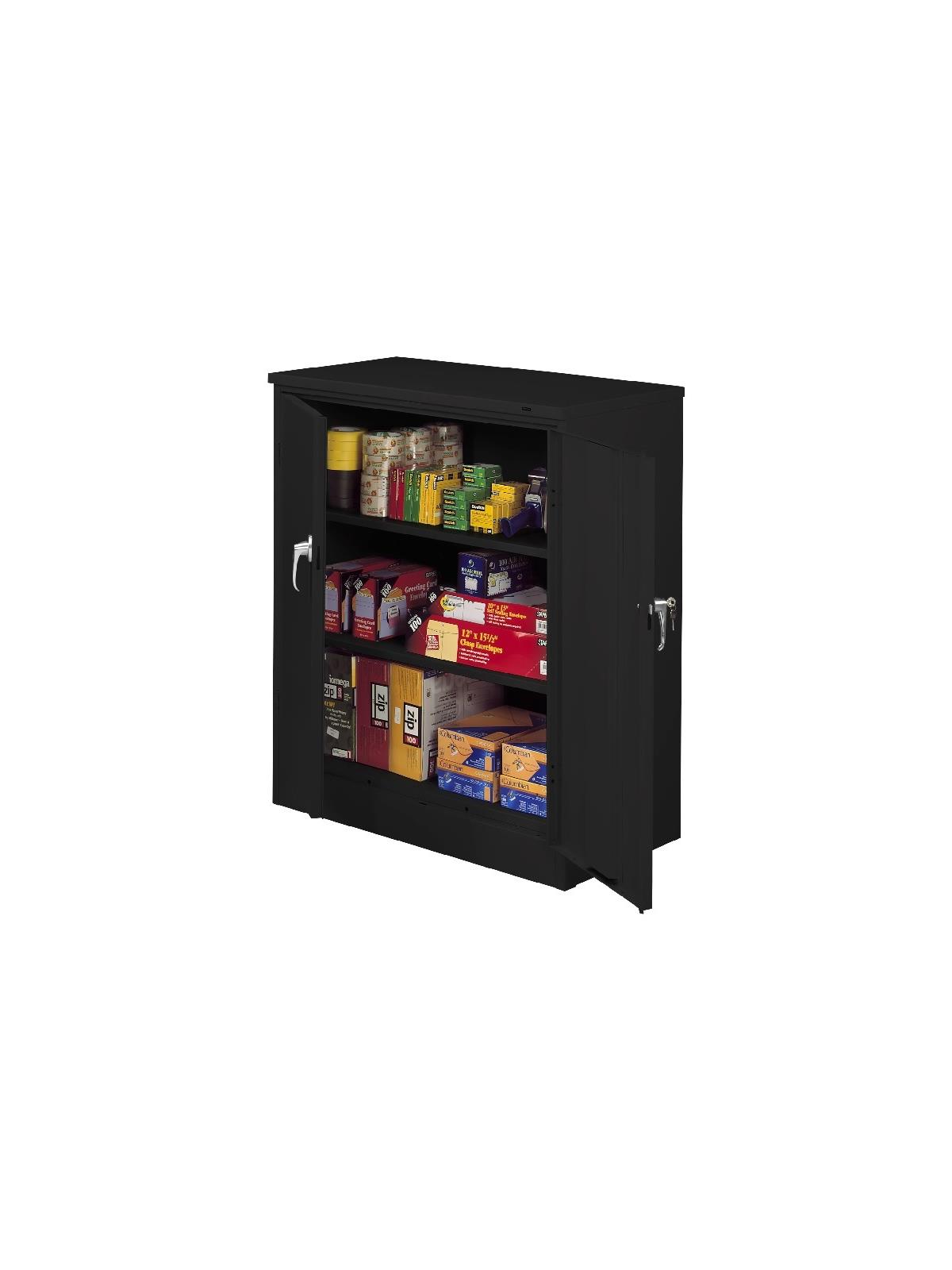 Knuckle hinges on each door insure the integrity of the cabinet and the alignment of the doors. Doors are reinforced for strength and quietness. Handle on right-hand door activates a 3-point system for added security; dummy handle on left-hand door. Shelves are adjustable in 2" increments on built-in shelf tabs. Shelves will hold up to 200 lbs. evenly distributed. Two front leveling glides compensate for uneven floors. Louvered back panel allows air circulation in the cabinet. Available in four models--storage, wardrobe, combination, and counter high cabinets. Available in Black, Champagne/Putty, Sand, Light Gray and Medium Gray. FOB Shipping Point.