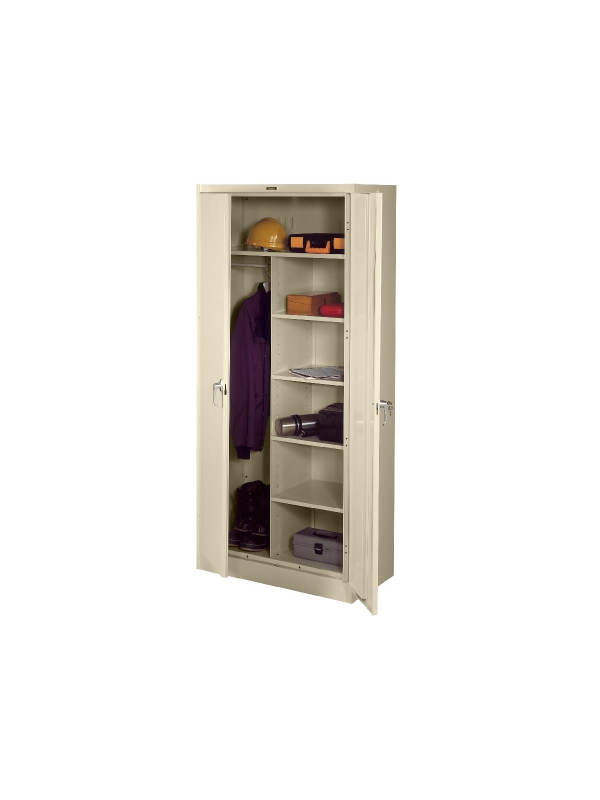 Knuckle hinges on each door insure the integrity of the cabinet and the alignment of the doors. Doors are reinforced for strength and quietness. Handle on right-hand door activates a 3-point system for added security; dummy handle on left-hand door. Shelves are adjustable in 2" increments on built-in shelf tabs. Shelves will hold up to 200 lbs. evenly distributed. Two front leveling glides compensate for uneven floors. Louvered back panel allows air circulation in the cabinet. Available in four models--storage, wardrobe, combination, and counter high cabinets. Available in Black, Champagne/Putty, Sand, Light Gray and Medium Gray. FOB Shipping Point.