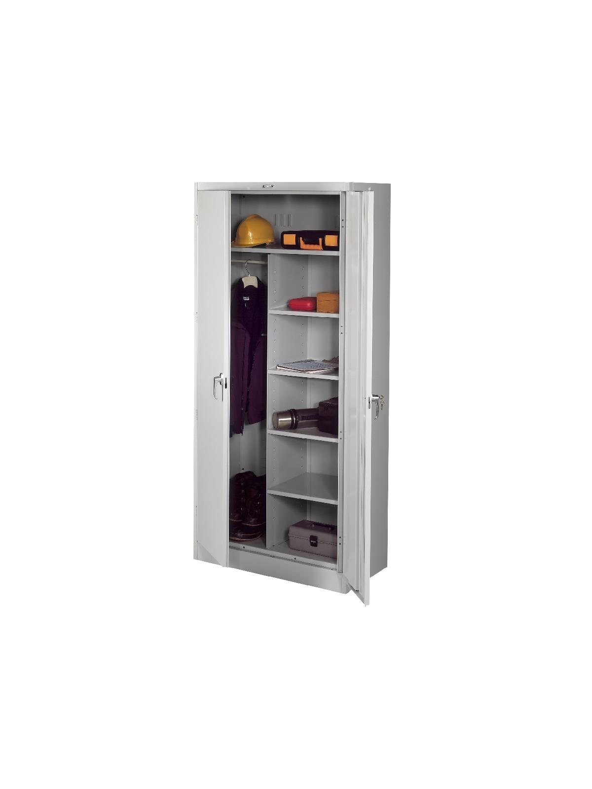 Knuckle hinges on each door insure the integrity of the cabinet and the alignment of the doors. Doors are reinforced for strength and quietness. Handle on right-hand door activates a 3-point system for added security; dummy handle on left-hand door. Shelves are adjustable in 2" increments on built-in shelf tabs. Shelves will hold up to 200 lbs. evenly distributed. Two front leveling glides compensate for uneven floors. Louvered back panel allows air circulation in the cabinet. Available in four models--storage, wardrobe, combination, and counter high cabinets. Available in Black, Champagne/Putty, Sand, Light Gray and Medium Gray. FOB Shipping Point.