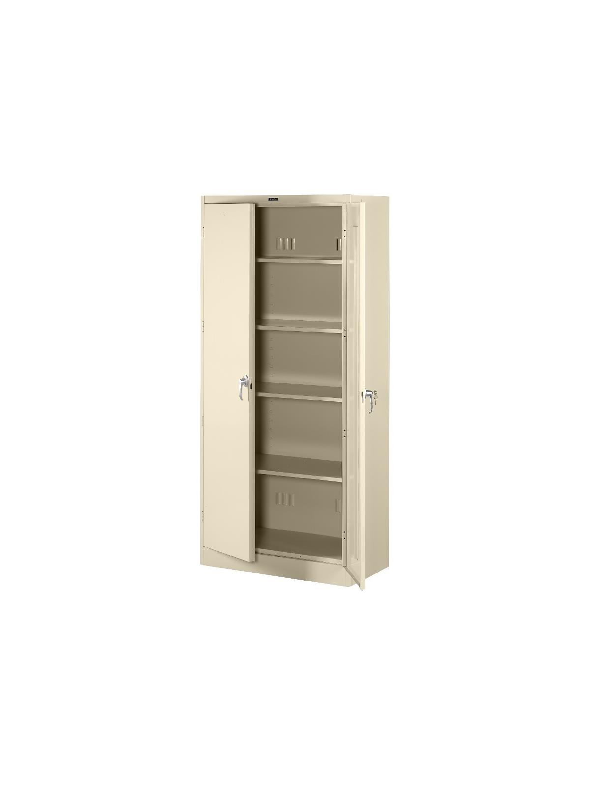 Knuckle hinges on each door insure the integrity of the cabinet and the alignment of the doors. Doors are reinforced for strength and quietness. Handle on right-hand door activates a 3-point system for added security; dummy handle on left-hand door. Shelves are adjustable in 2" increments on built-in shelf tabs. Shelves will hold up to 200 lbs. evenly distributed. Two front leveling glides compensate for uneven floors. Louvered back panel allows air circulation in the cabinet. Available in four models--storage, wardrobe, combination, and counter high cabinets. Available in Black, Champagne/Putty, Sand, Light Gray and Medium Gray. FOB Shipping Point.