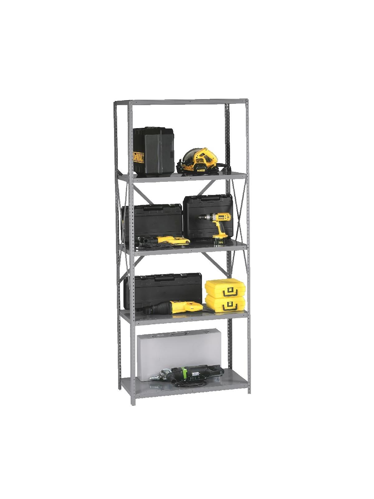 The unique shelf design has deep box-beam formations front and back, fully lapped and welded corners and double-ribbed outside surfaces on the box formation. In addition, the front and rear flange on the box beam is welded every 3". The result is load capacities that range all the way up to 1000 lbs. Shelves can be adjusted quickly and easily in 1" increments to make maximum use of vertical space. Five shelves including top and bottom shelves. Choose from open or closed units. Additional shelves are available as well as adjustable shelf dividers, shelf boxes and doors. Starter unit can be used individually or combined with adder units to form a row of shelving. Shipped unassembled. Medium gray finish. FOB Shipping Point.