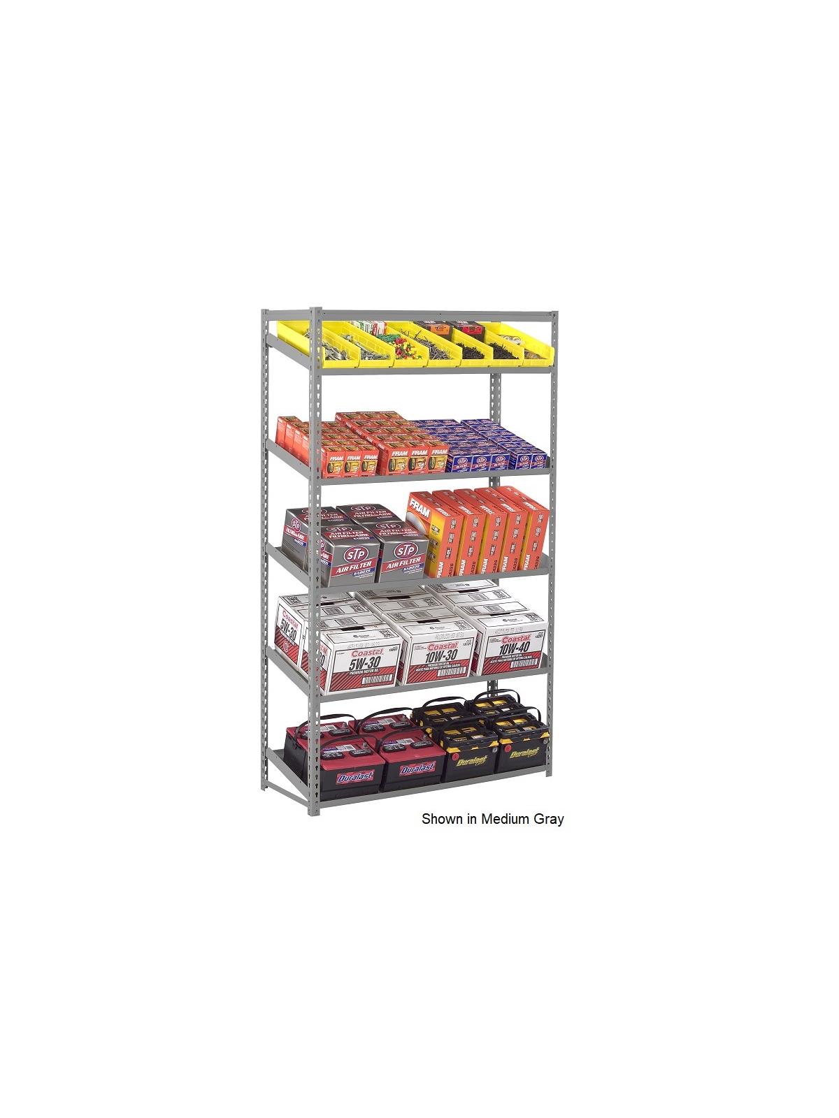 Parts, bins and boxes slide forward for easy picking. Open access from all sides. Place back to back to double shelf depth. Canopy top has box formed construction. Features 2" side flange to retain product. 1/2" front lip acts as a product stop. Heavy gauge shelf supports. Shelves support up to 450 lb. loads. Boltless construction - easy assembly with only a mallet. 5 sloping steel shelves per unit. 18"D. shelves slope 12 degrees. 24"D. shelves slope 14 degrees. Starter unit can be used individually or combined with adder units to form a row of shelving. Medium Gray or Sand finish. FOB Shipping Point.