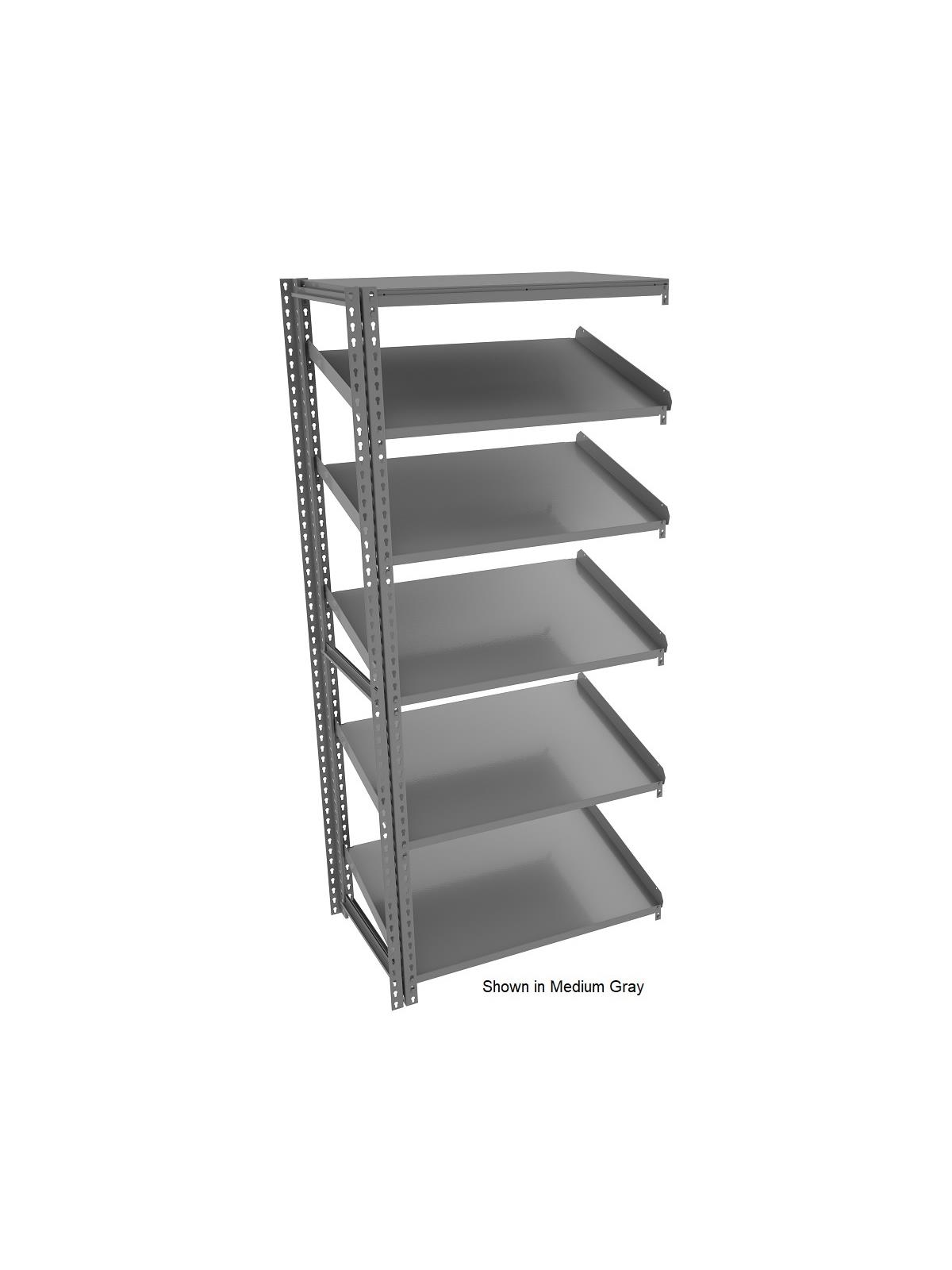 Parts, bins and boxes slide forward for easy picking. Open access from all sides. Place back to back to double shelf depth. Canopy top has box formed construction. Features 2" side flange to retain product. 1/2" front lip acts as a product stop. Heavy gauge shelf supports. Shelves support up to 450 lb. loads. Boltless construction - easy assembly with only a mallet. 5 sloping steel shelves per unit. 18"D. shelves slope 12 degrees. 24"D. shelves slope 14 degrees. Starter unit can be used individually or combined with adder units to form a row of shelving. Medium Gray or Sand finish. FOB Shipping Point.