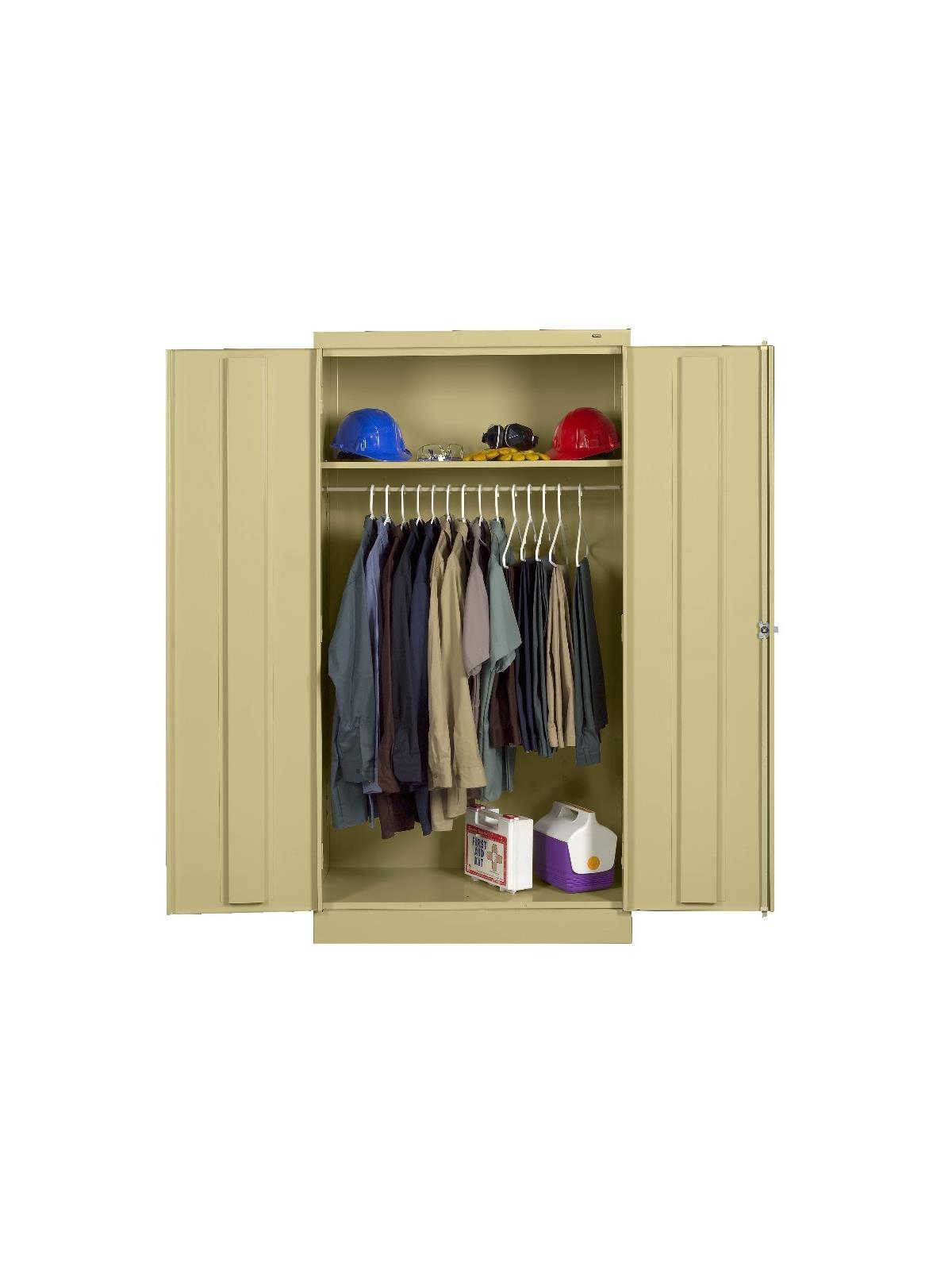 Shelves adjust in 2" increments. Heavy-steel construction with leaf hinges and reinforced doors stand up to a lifetime of heavy use. Handle on right-hand door activates the three-point locking system to keep belongings secure. Raised base keeps contents from contacting moisture from the floor. Available in 3 models--storage, wardrobe and combination. Available in Black, Champagne/Putty, Sand, Light Gray and Medium Gray. FOB Shipping Point.