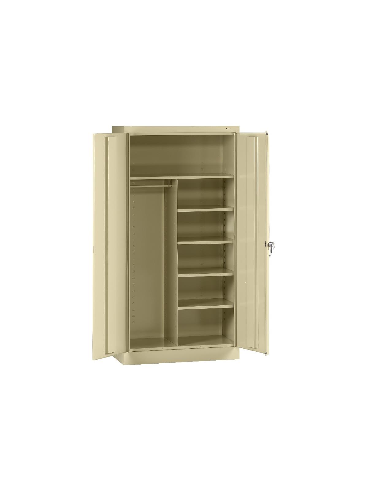 Shelves adjust in 2" increments. Heavy-steel construction with leaf hinges and reinforced doors stand up to a lifetime of heavy use. Handle on right-hand door activates the three-point locking system to keep belongings secure. Raised base keeps contents from contacting moisture from the floor. Available in 3 models--storage, wardrobe and combination. Available in Black, Champagne/Putty, Sand, Light Gray and Medium Gray. FOB Shipping Point.