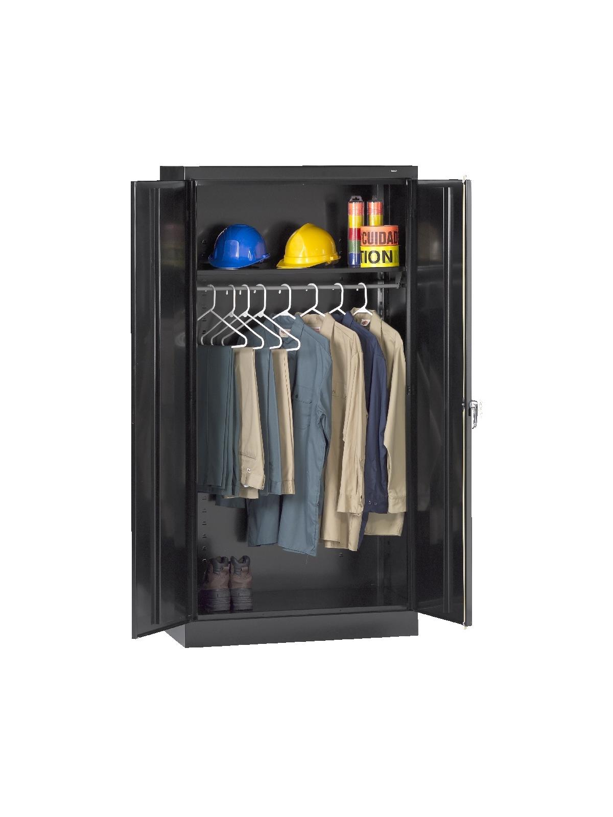 Shelves adjust in 2" increments. Heavy-steel construction with leaf hinges and reinforced doors stand up to a lifetime of heavy use. Handle on right-hand door activates the three-point locking system to keep belongings secure. Raised base keeps contents from contacting moisture from the floor. Available in 3 models--storage, wardrobe and combination. Available in Black, Champagne/Putty, Sand, Light Gray and Medium Gray. FOB Shipping Point.