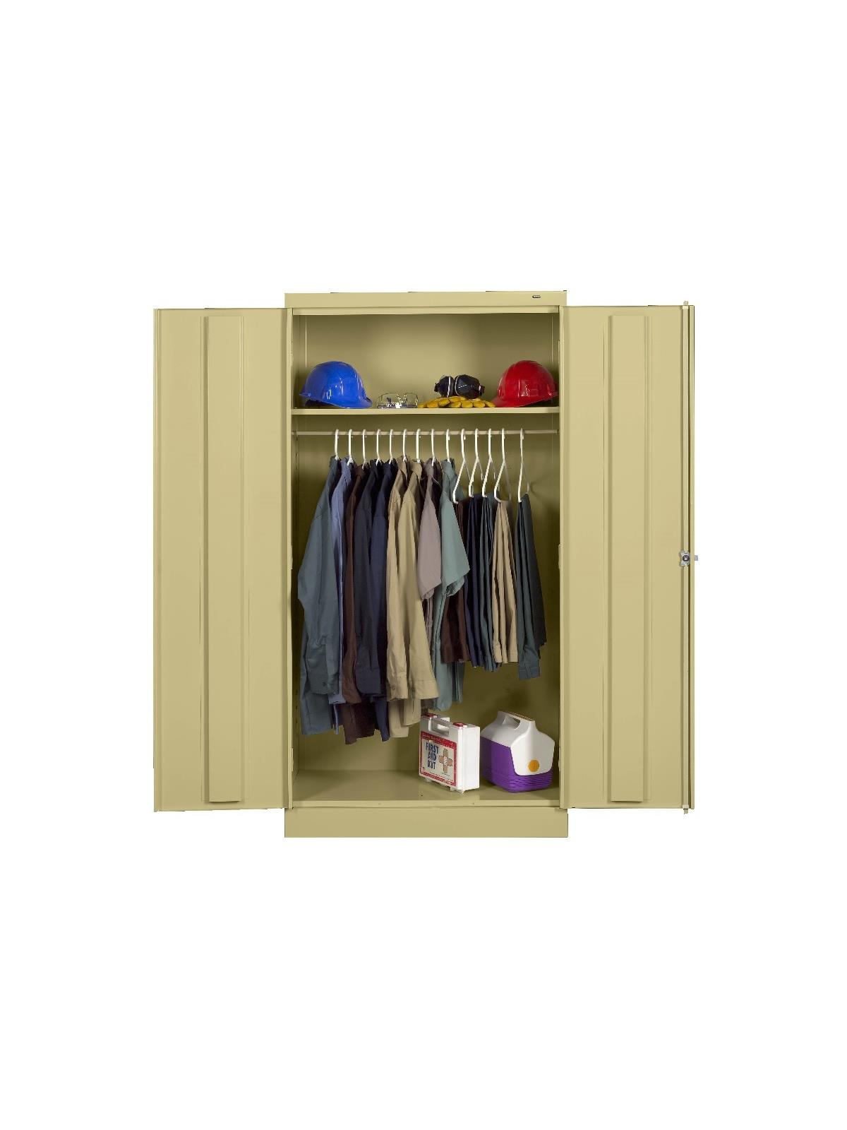 Shelves adjust in 2" increments. Heavy-steel construction with leaf hinges and reinforced doors stand up to a lifetime of heavy use. Handle on right-hand door activates the three-point locking system to keep belongings secure. Raised base keeps contents from contacting moisture from the floor. Available in 3 models--storage, wardrobe and combination. Available in Black, Champagne/Putty, Sand, Light Gray and Medium Gray. FOB Shipping Point.