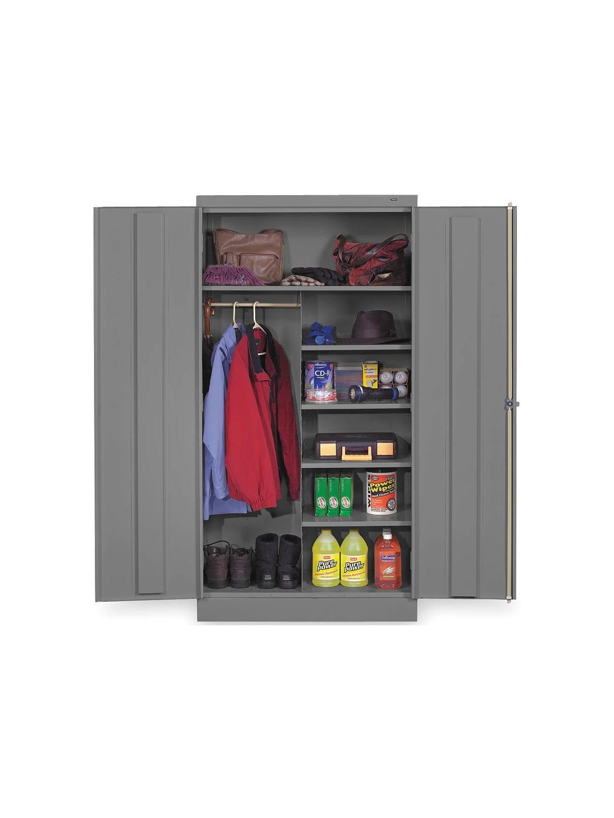 Shelves adjust in 2" increments. Heavy-steel construction with leaf hinges and reinforced doors stand up to a lifetime of heavy use. Handle on right-hand door activates the three-point locking system to keep belongings secure. Raised base keeps contents from contacting moisture from the floor. Available in 3 models--storage, wardrobe and combination. Available in Black, Champagne/Putty, Sand, Light Gray and Medium Gray. FOB Shipping Point.